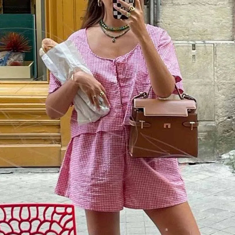 KYLETHOMASW - Vintage Plaid 2 Piece Set Front Tie Up Short Sleeve Blouse Shirt Crop Tops + Wide Leg Shorts Women Boho Beach Loose Matching Set