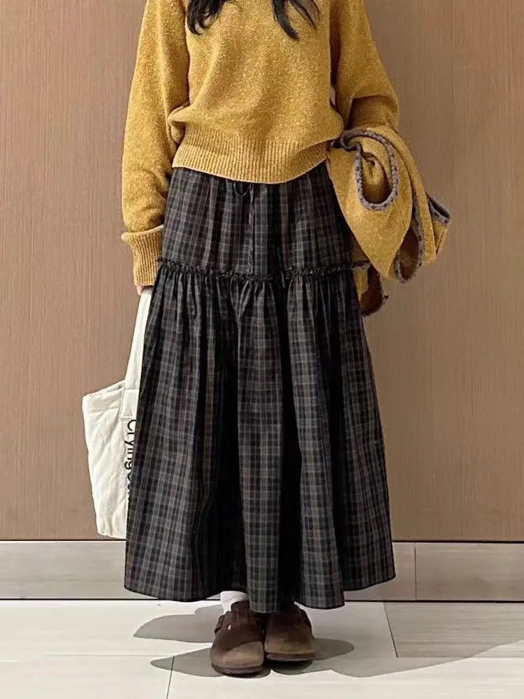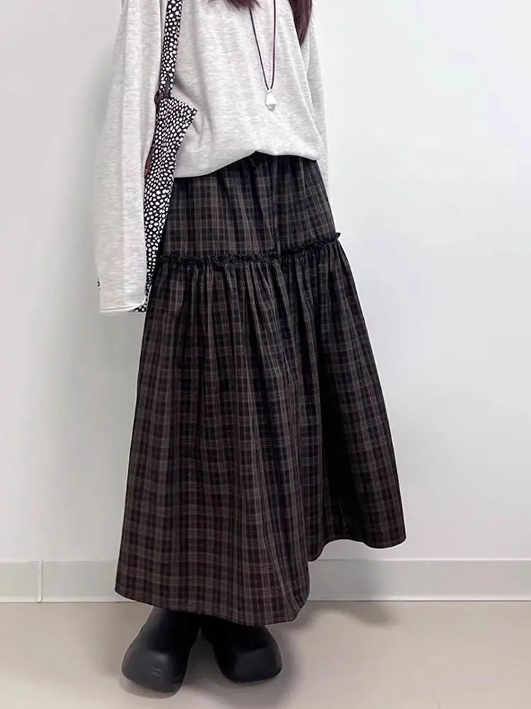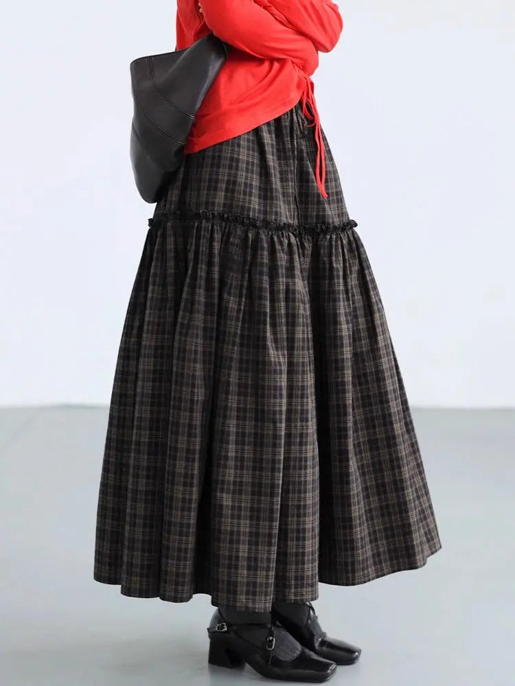 KYLETHOMASW - Vintage Skirts Women Plaid Ruffles Patchwork Stretch High Waist Loose Vintage Fashion Sweet Elegant Long Skirt Casual