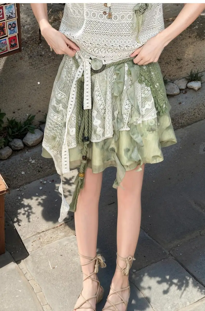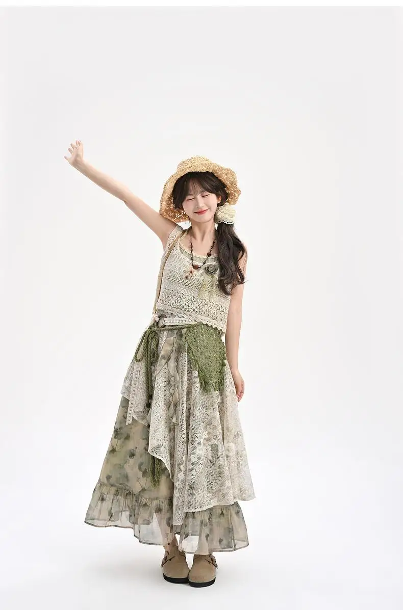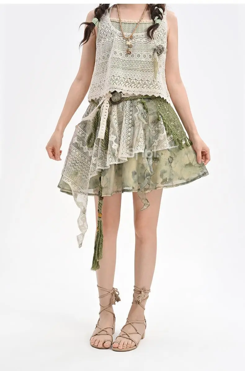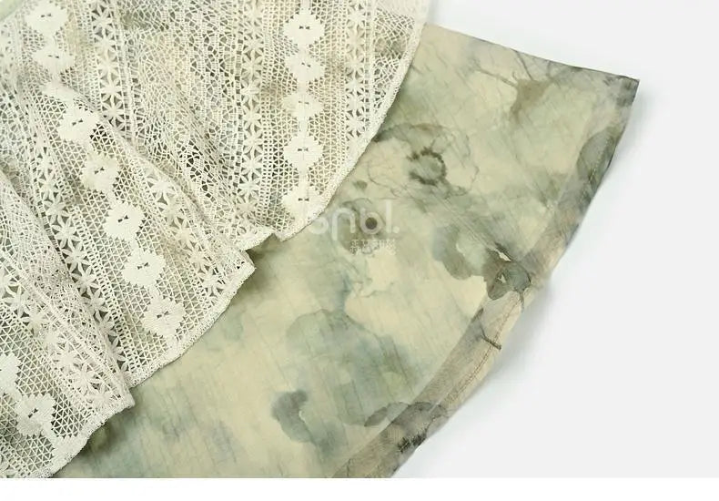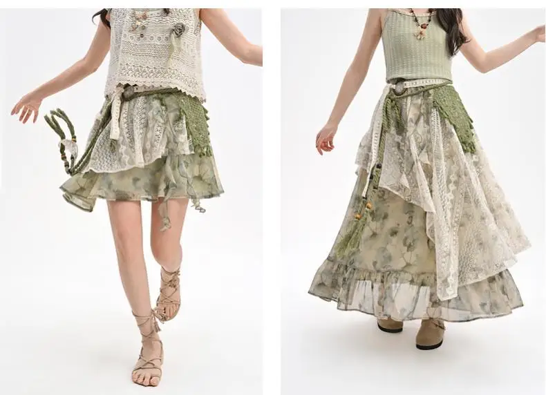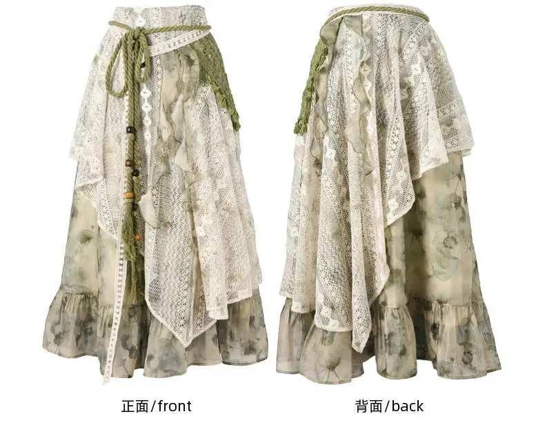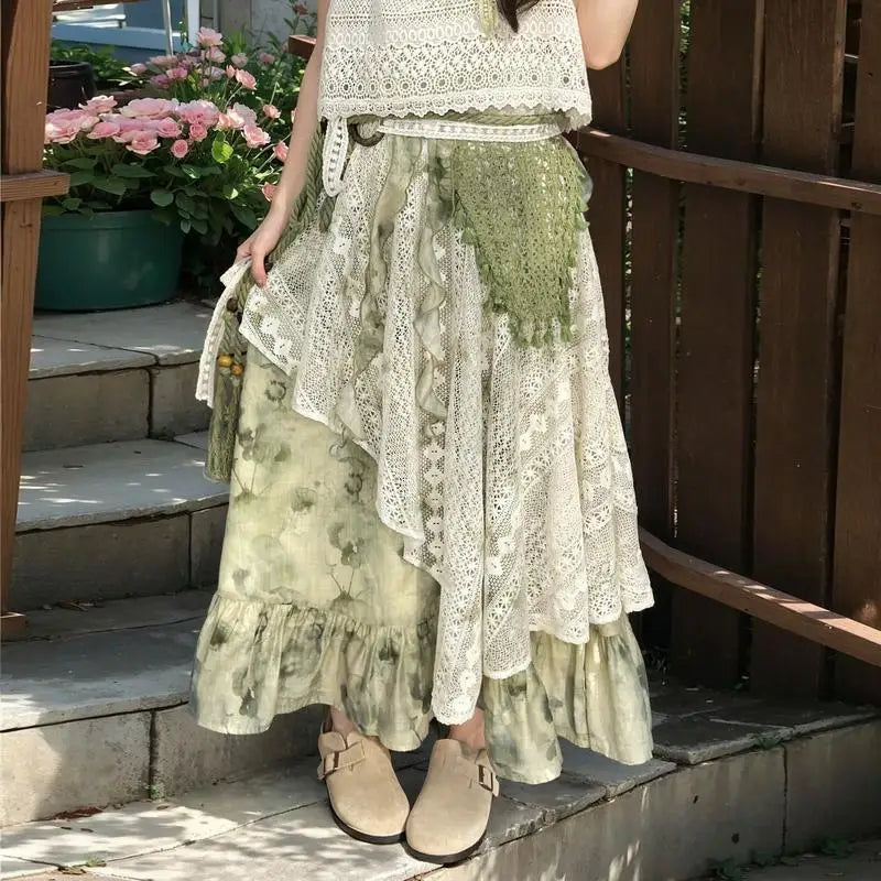 KYLETHOMASW - Vintage Tie Dye Printed Skirt Women Asymmetrical a-Line Skirt Elegant Lace Patchwork Midi Skirts Summer Y2k Mori Girl Skirt A056