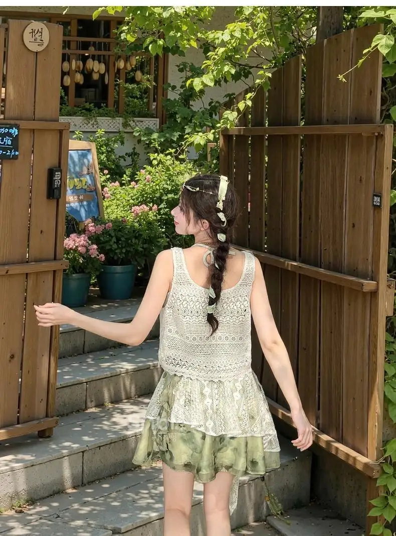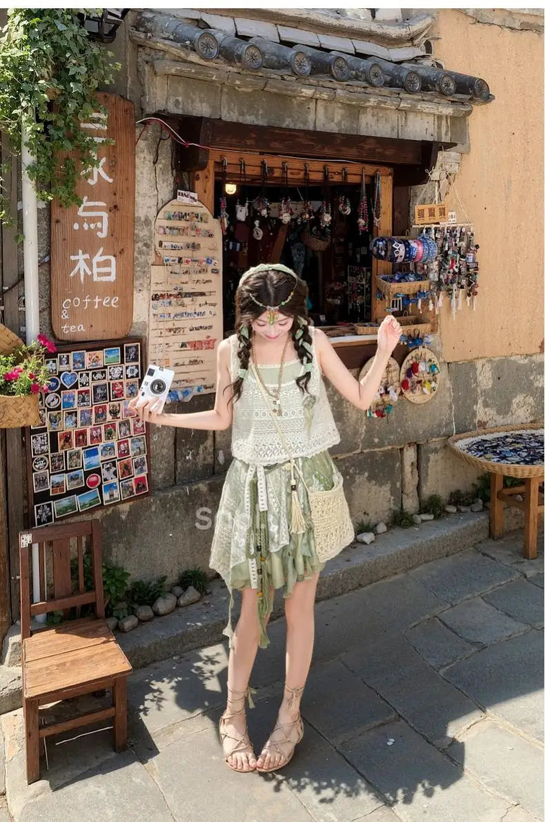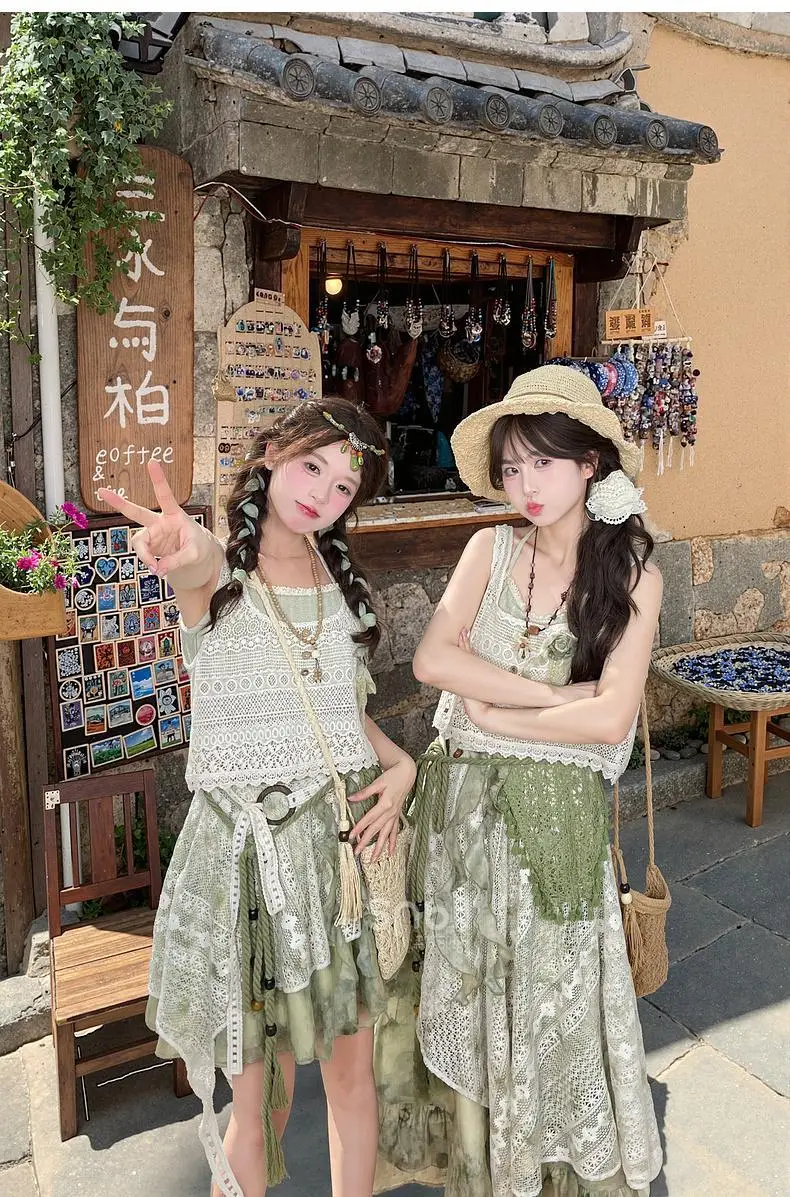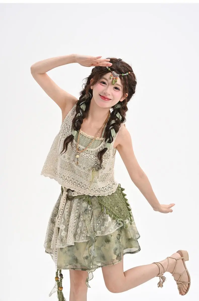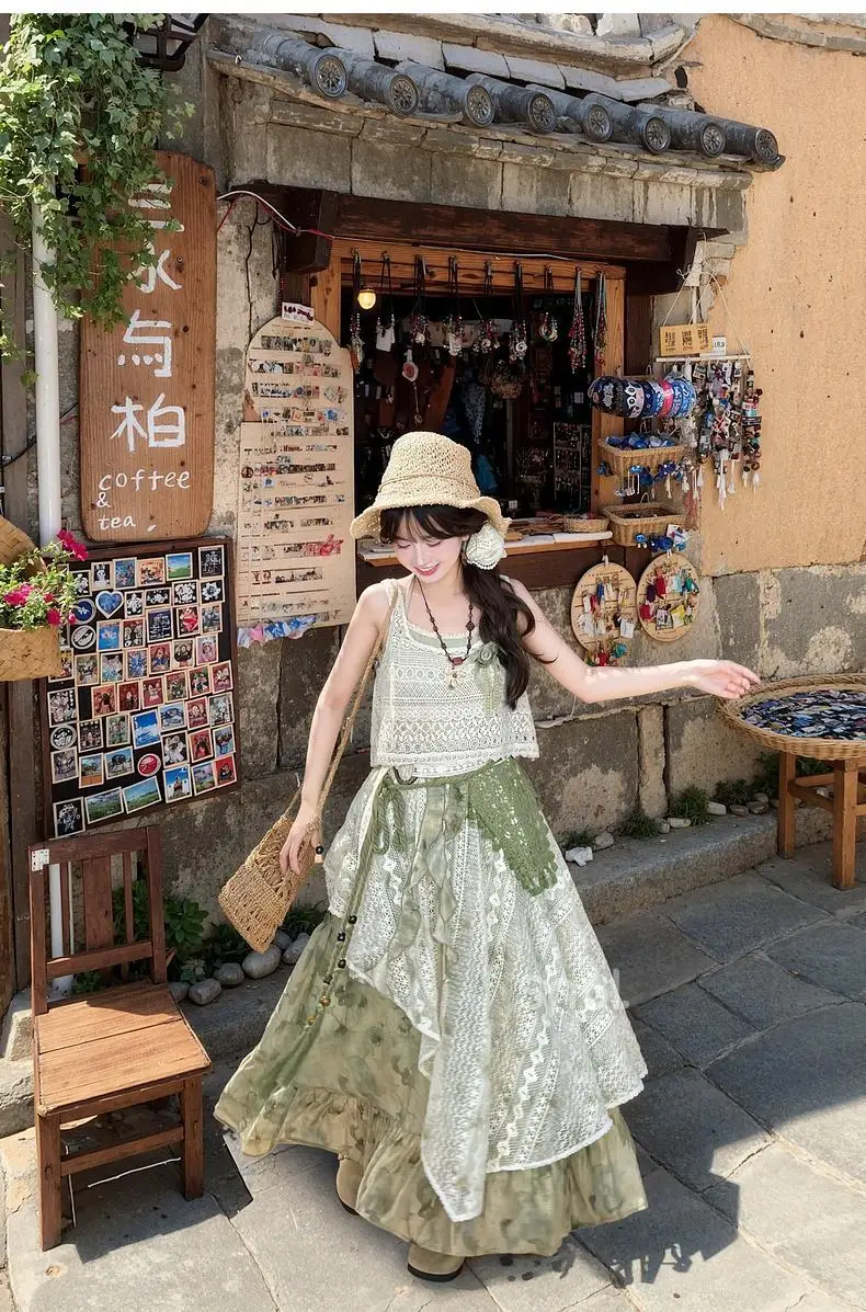 KYLETHOMASW - Vintage Tie Dye Printed Skirt Women Asymmetrical a-Line Skirt Elegant Lace Patchwork Midi Skirts Summer Y2k Mori Girl Skirt A056