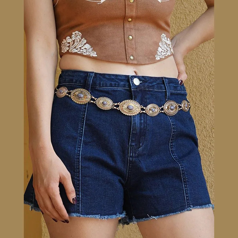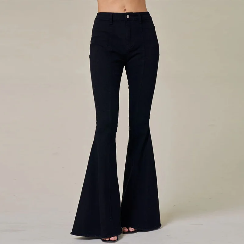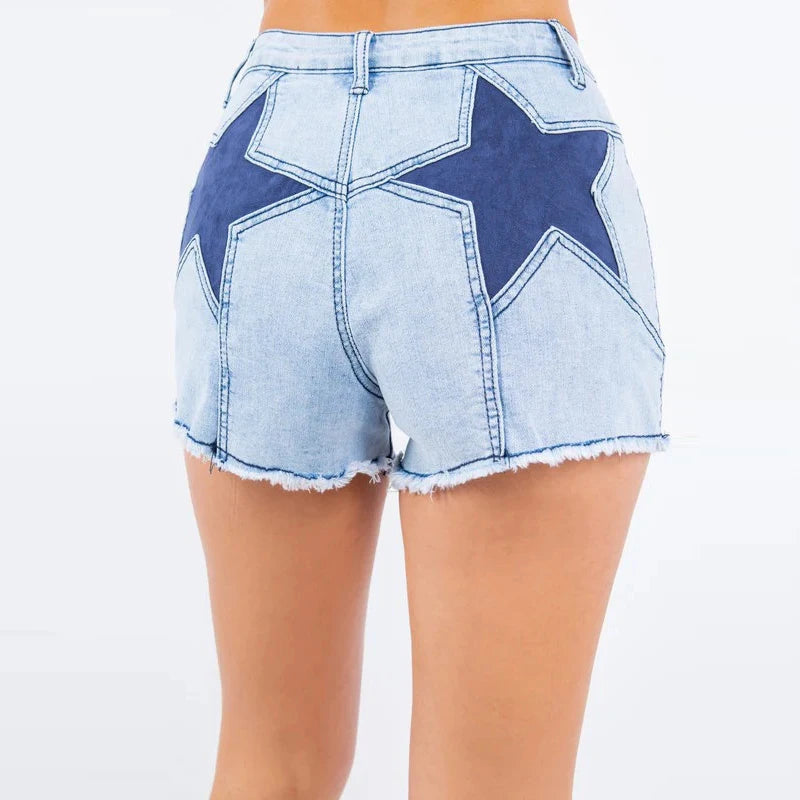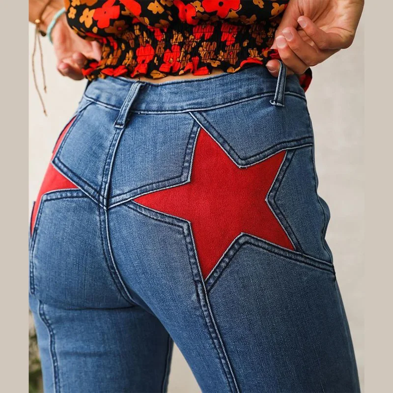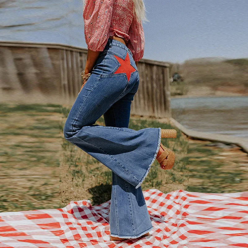 KYLETHOMASW - Vintage Women Contrast Five-point Star Patchwork Denim Flared Pants Baggy Dragging Jeans Trousers Chic Elegant Casual Short Pant