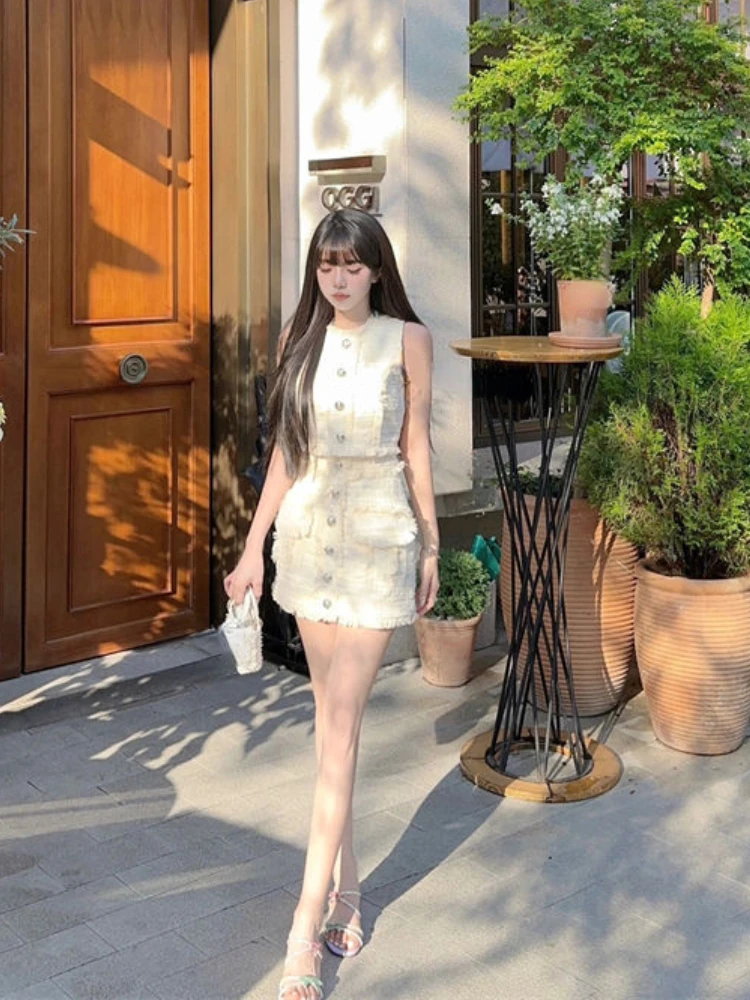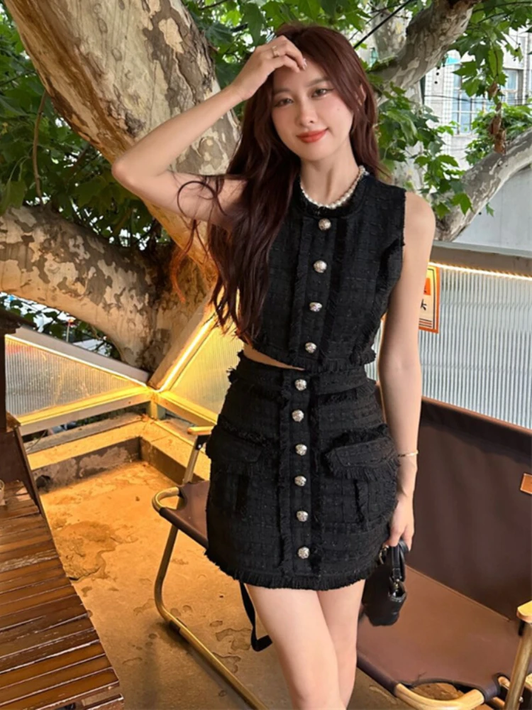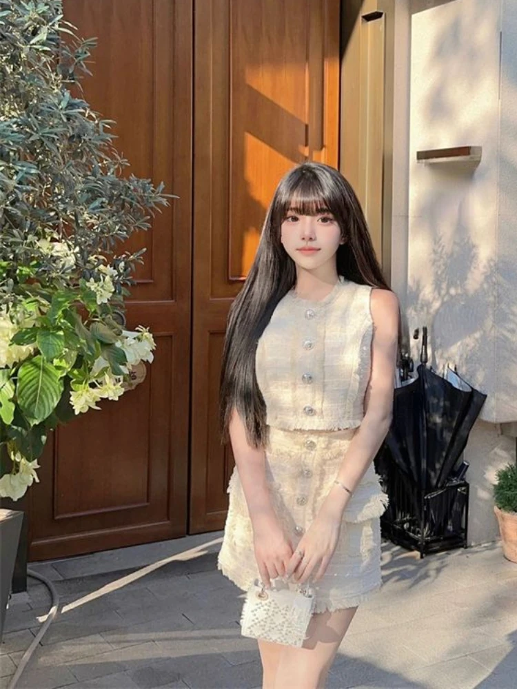 KYLETHOMASW - Vintage Y2k 2 Piece Skirts Set Women Casual Sleeveless Crop Top Vest + Mini Skirts Korean Fashion Suits Even Party Outfits Party