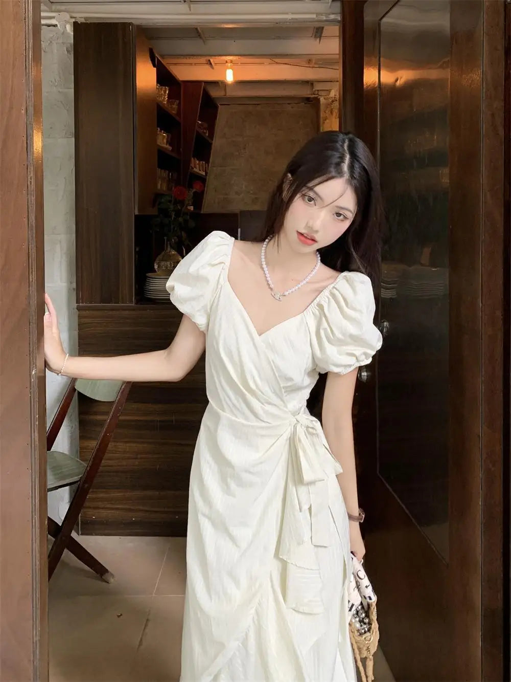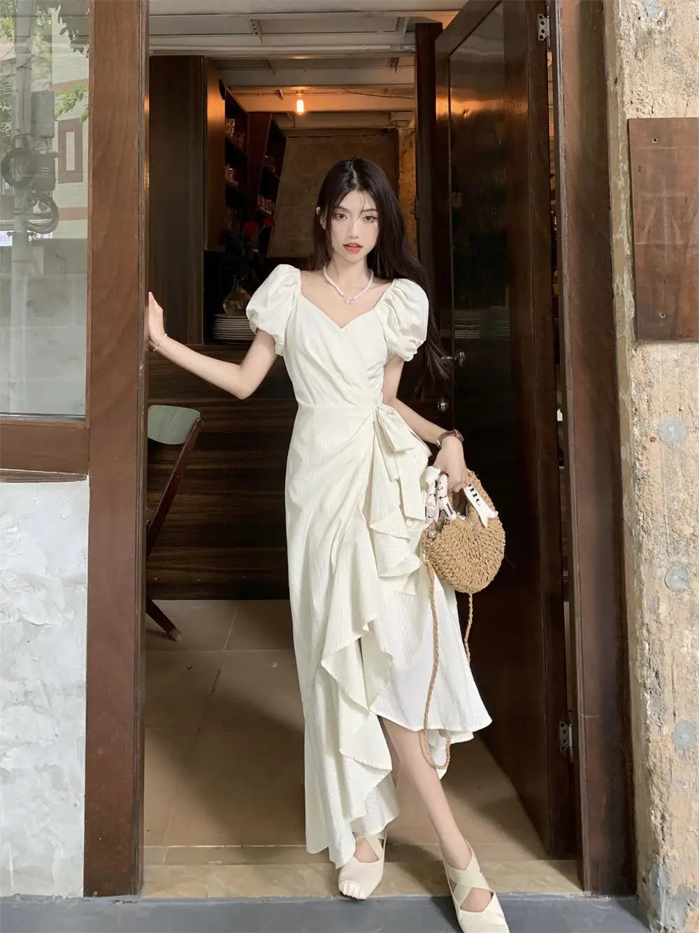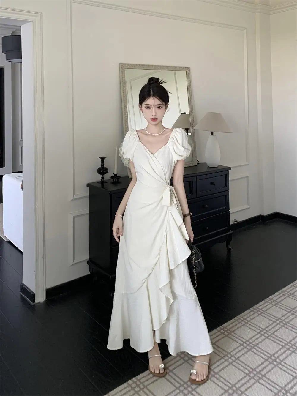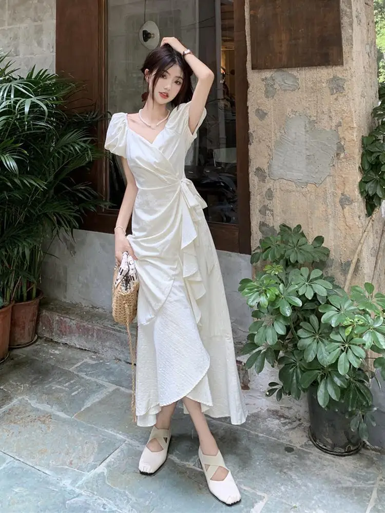KYLETHOMASW - White V-neck Lace Up Short Sleeved Dress Women Summer New Lotus Leaf Edge Waist Cinching Slim Temperament Long Dresses