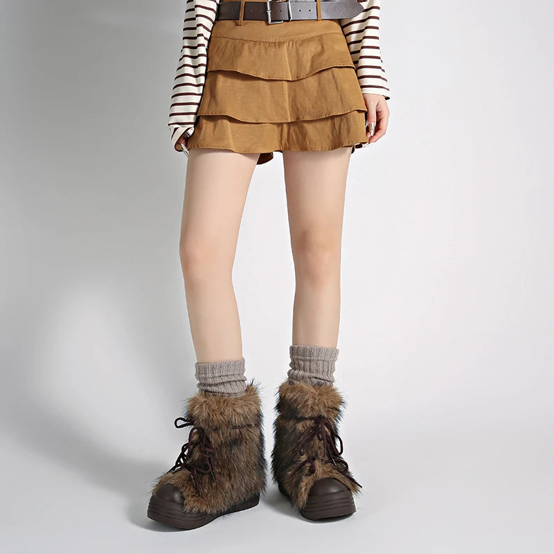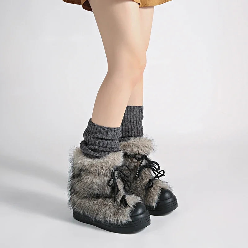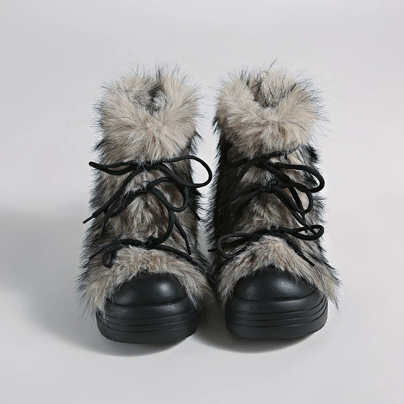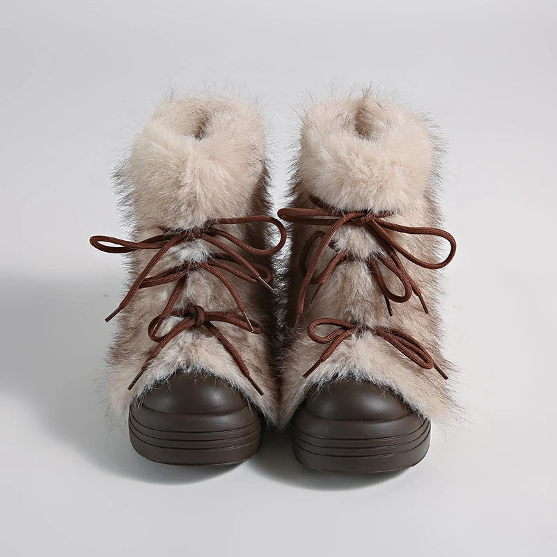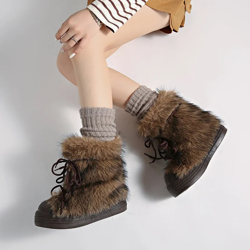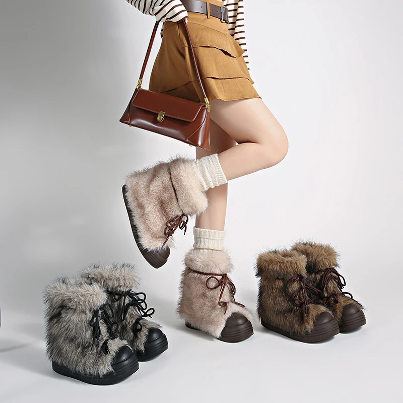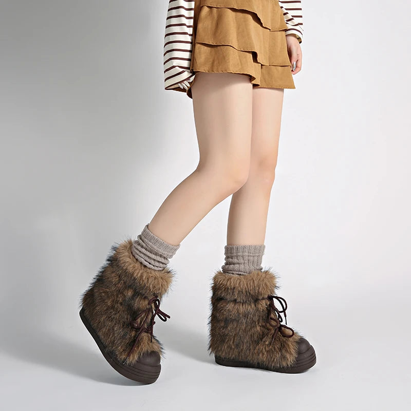 KYLETHOMASW - Winter Furry Lace Up Women Snow Boots Concise Height Increase Shoes Female Thick Sole Warm Cotton Short Booties Zapatos De Muje