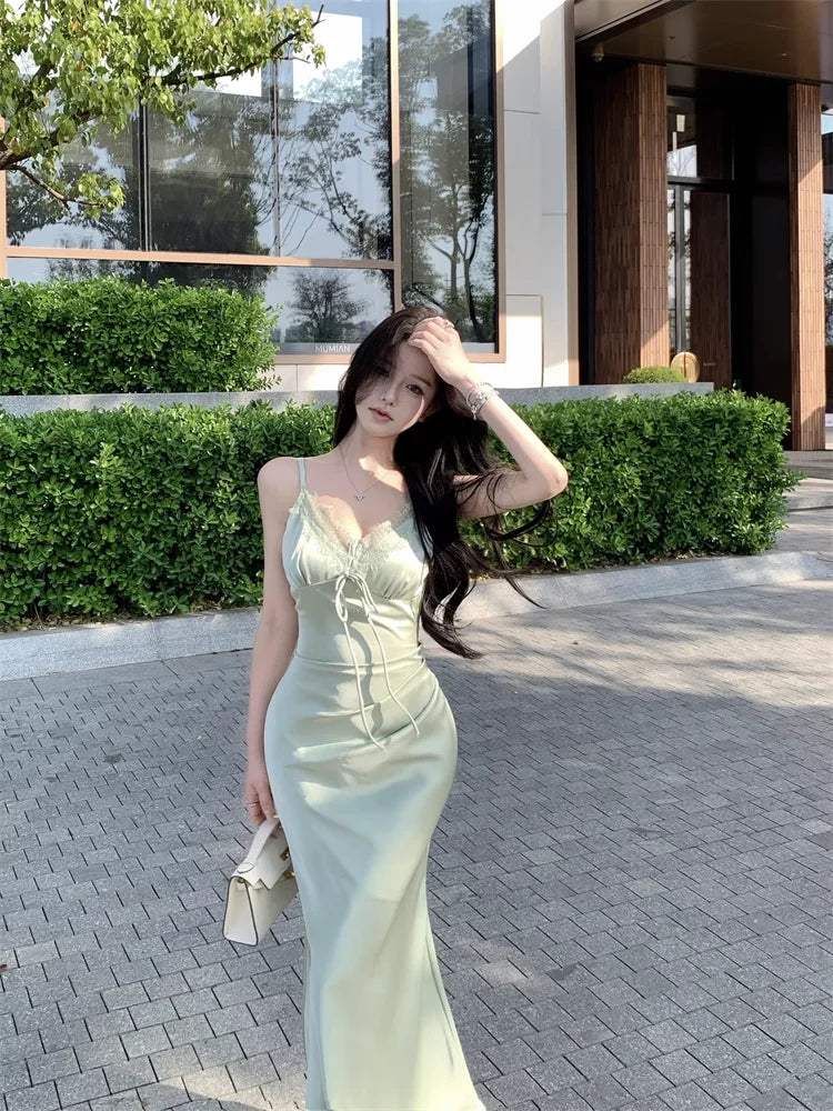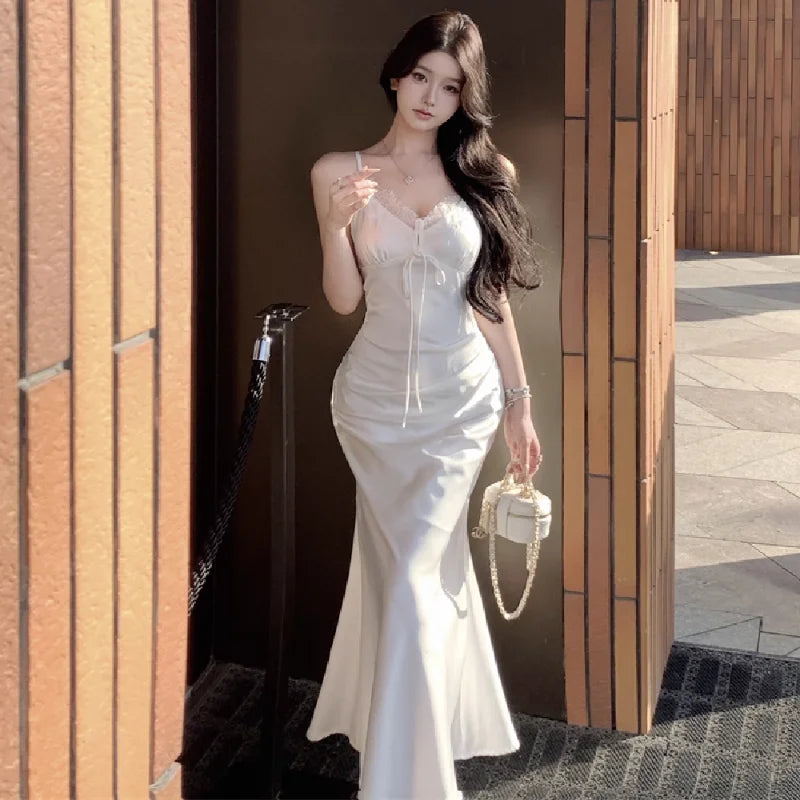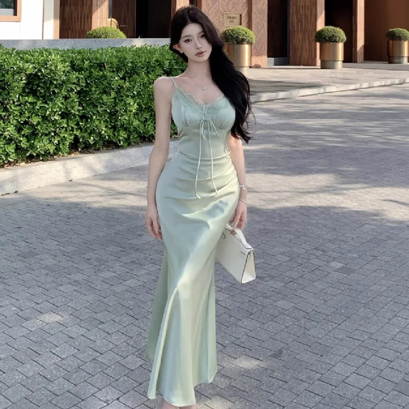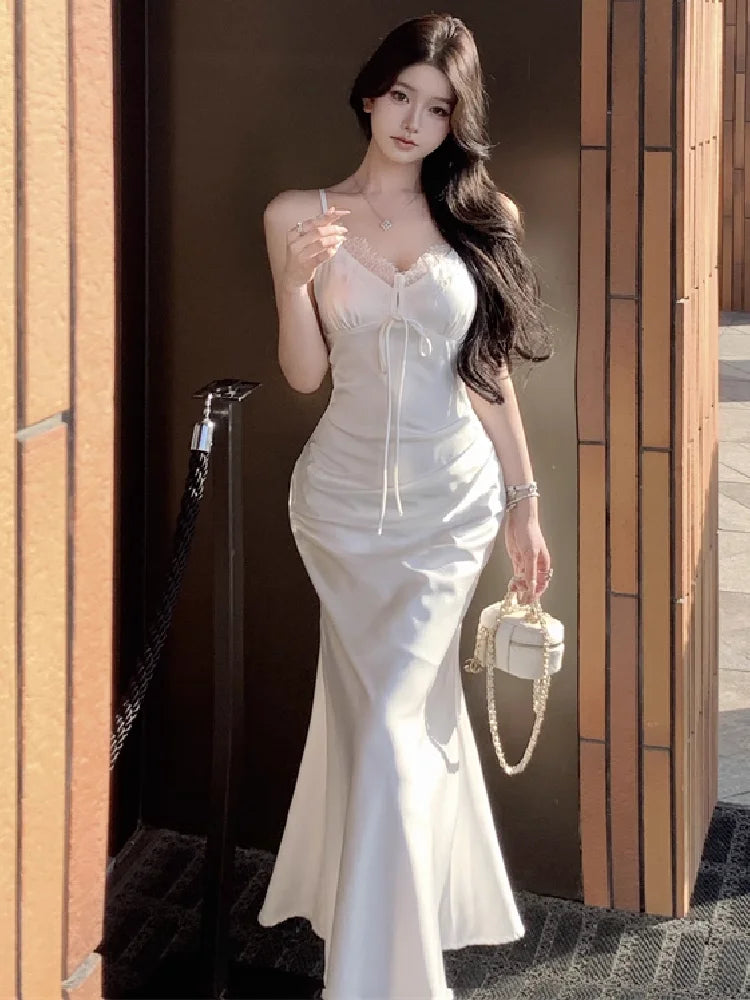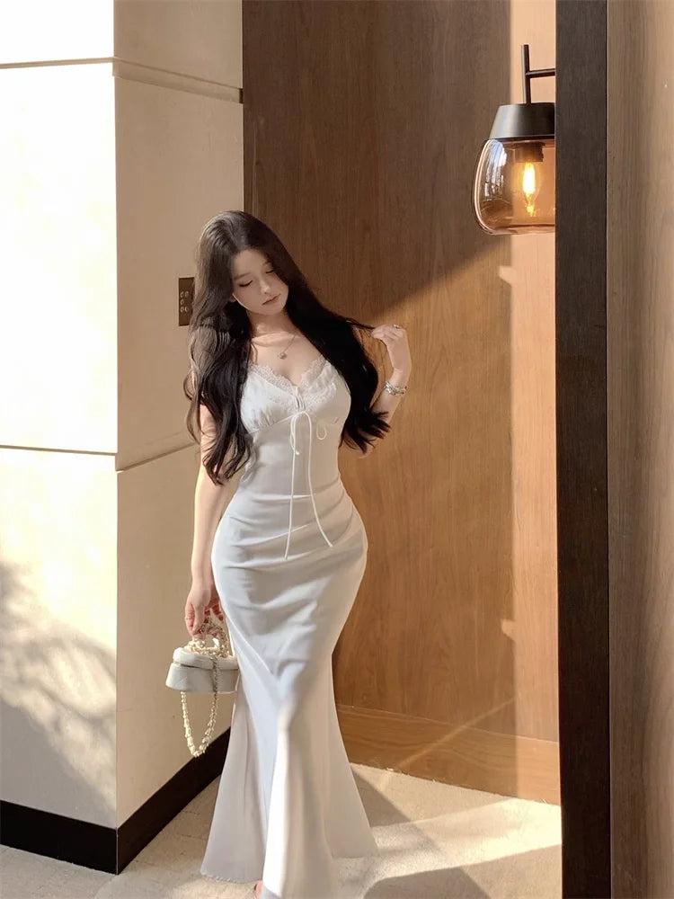 KYLETHOMASW - Woman Dress Sleeveless Satin V Neck Lace Patchwork Bandage Sexy Elegant Backless Mermaid Dresses Party Female Fashion