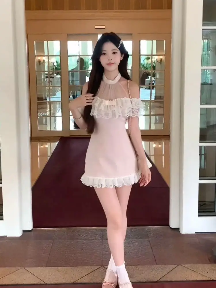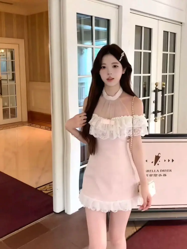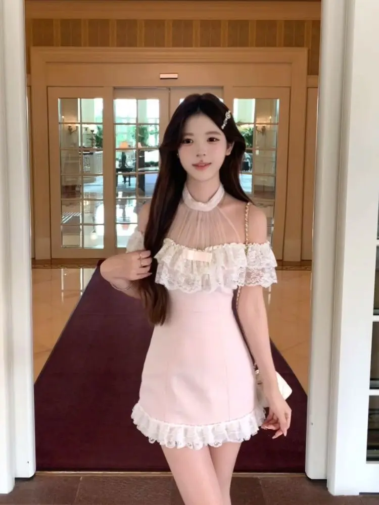 KYLETHOMASW - Woman Dress Sweet Halter Off Shoulder Slim Sexy Elegant Bow Lace Patchwork Princess Party Mini Dresses Party Ladies