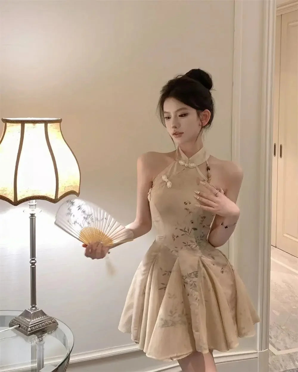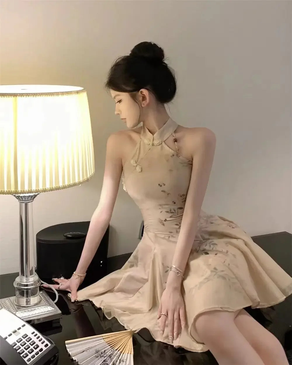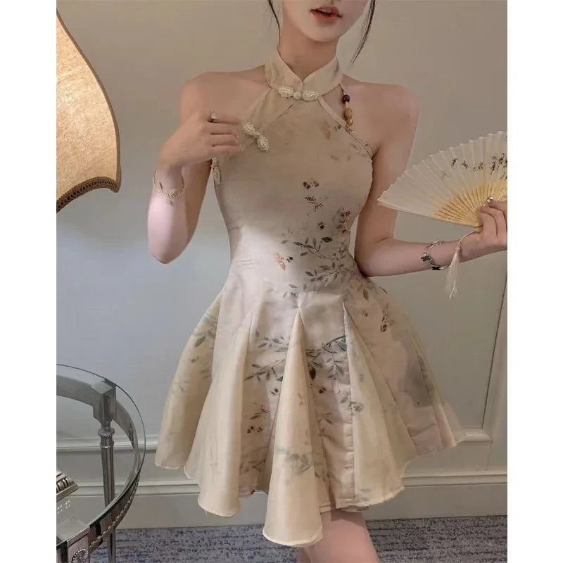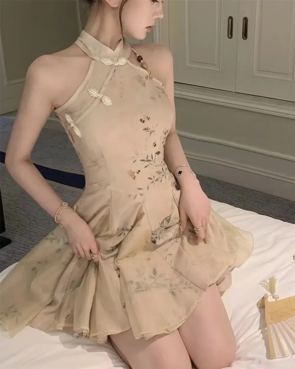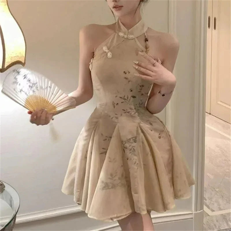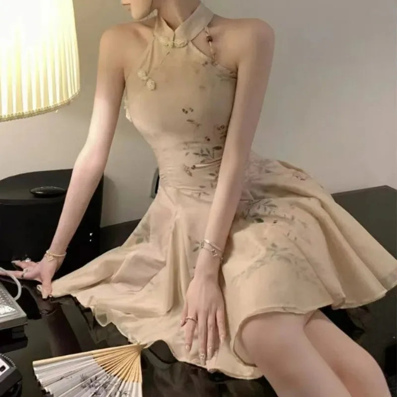 KYLETHOMASW - Women Chinese Style Vintage Sexy Halter Sleeveless Mini Dress Summer Stand Collar High Waist Slim Elegant Party Dresses Vestidos