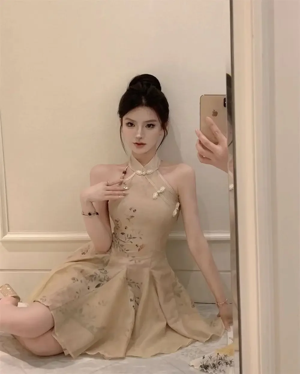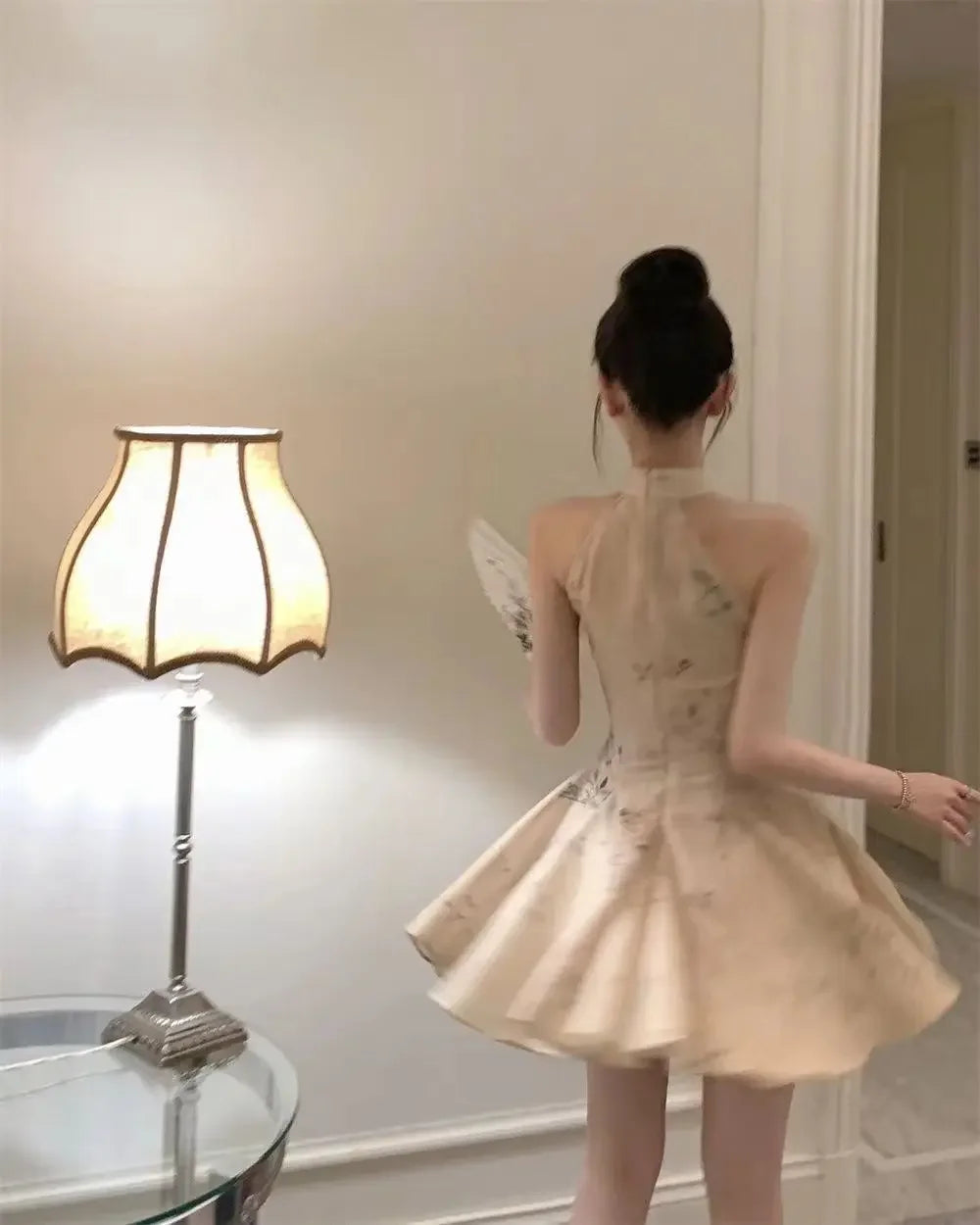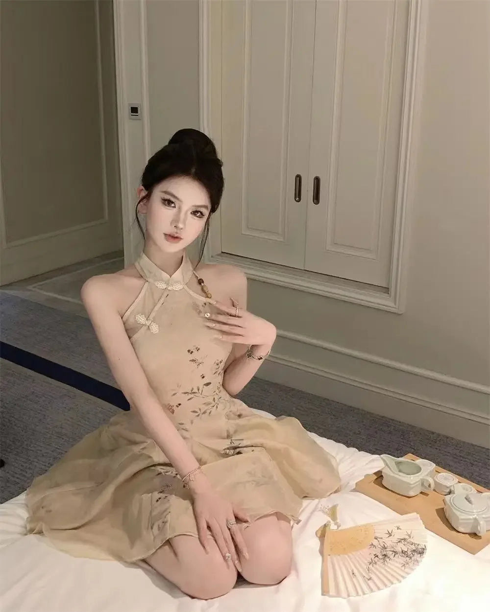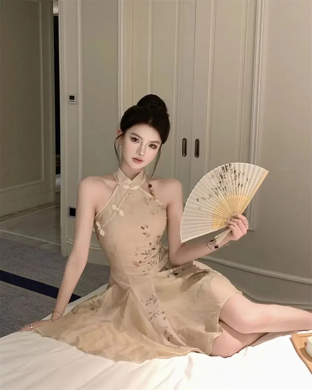 KYLETHOMASW - Women Chinese Style Vintage Sexy Halter Sleeveless Mini Dress Summer Stand Collar High Waist Slim Elegant Party Dresses Vestidos
