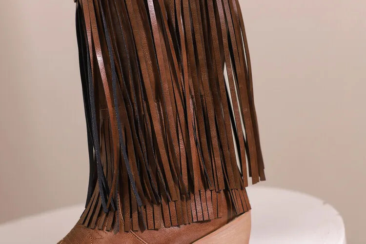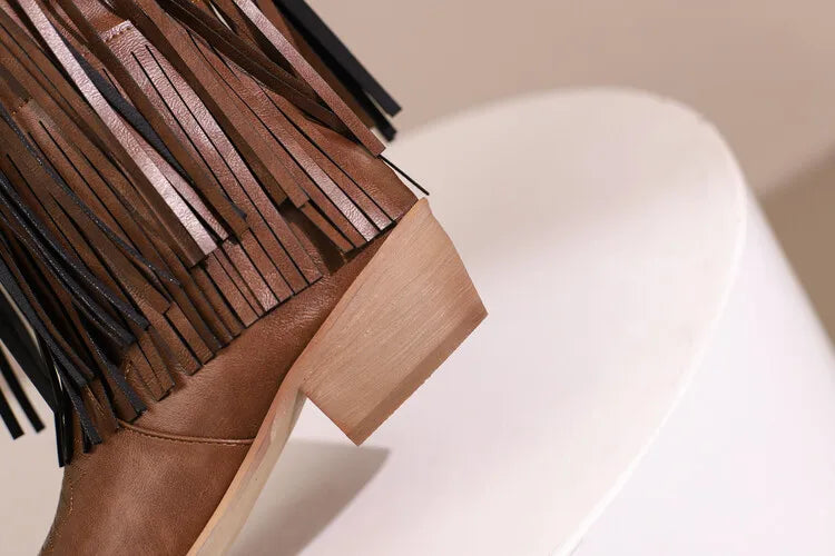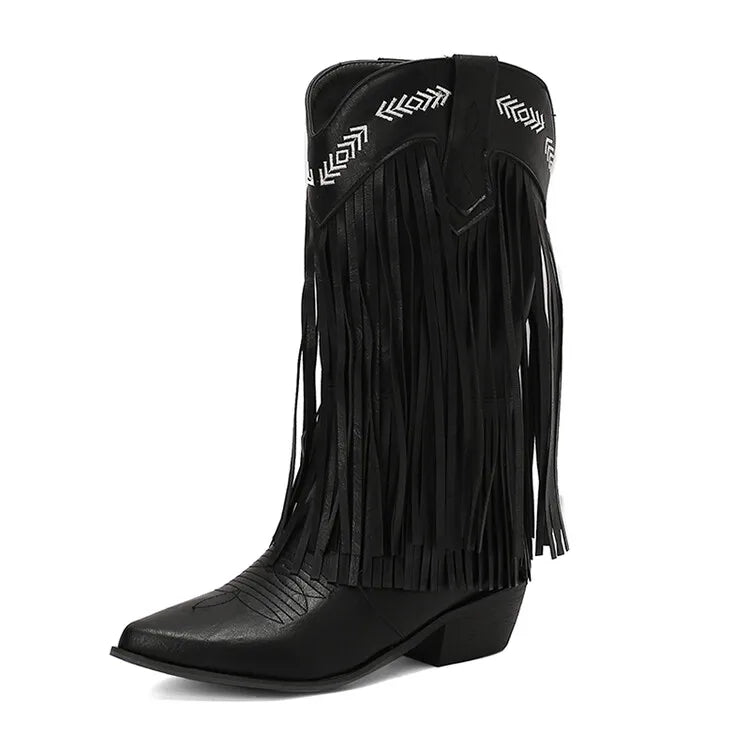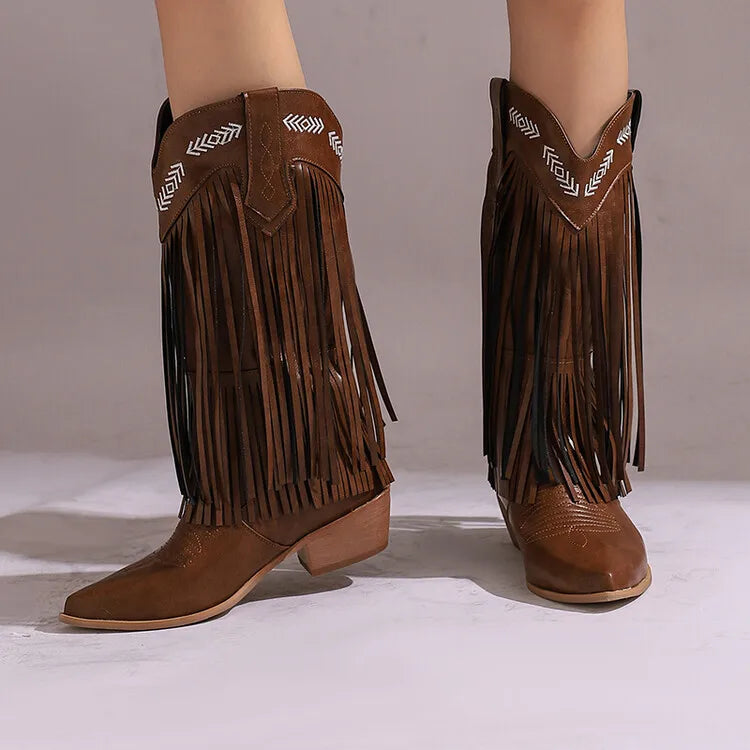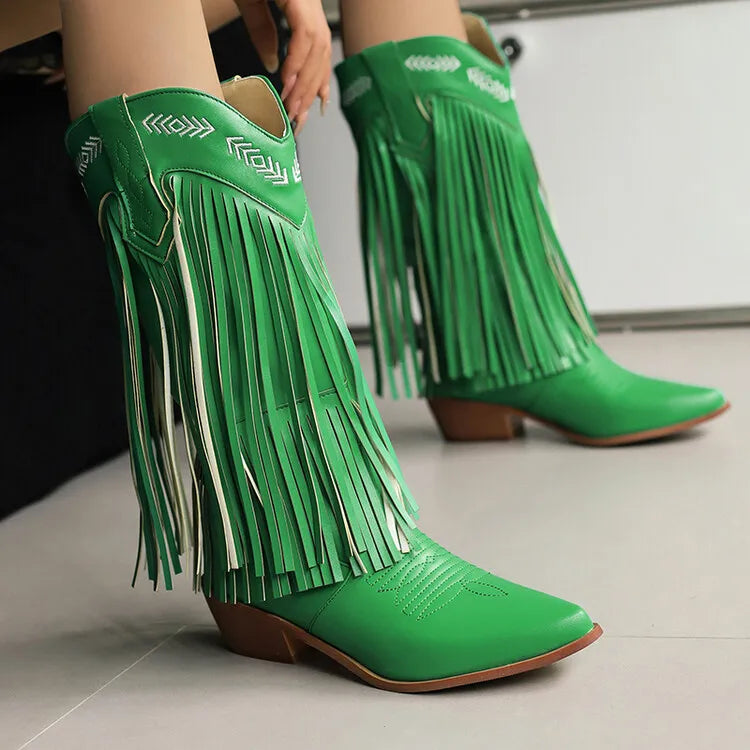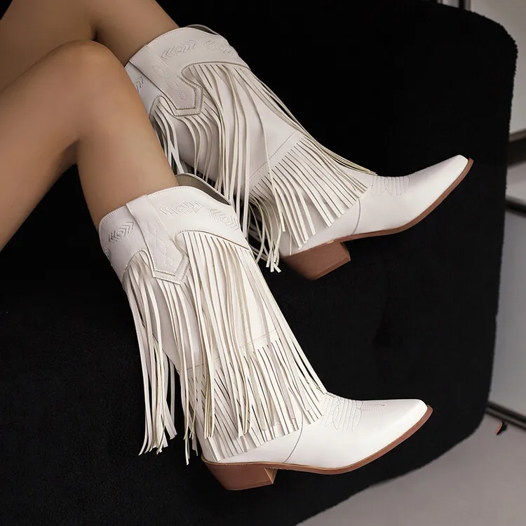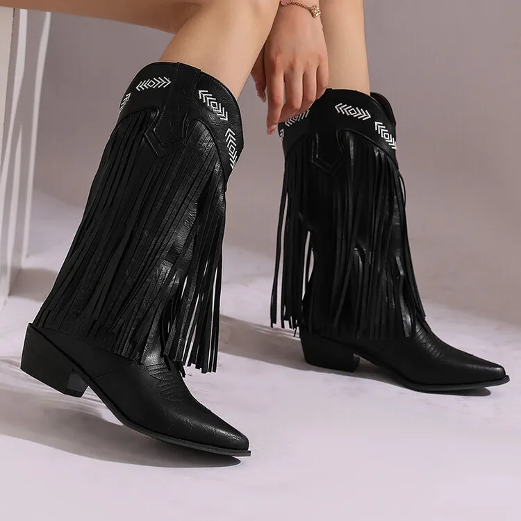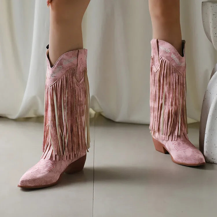 KYLETHOMASW - Women Fringe Western Boots Pink Sweet Embroidered Boots Brown Tassels Block Medium Heels Shoes Plus Size 48 Lady Winter