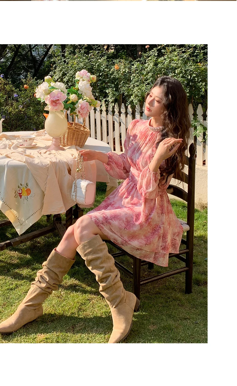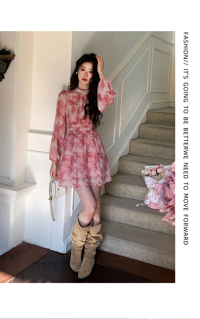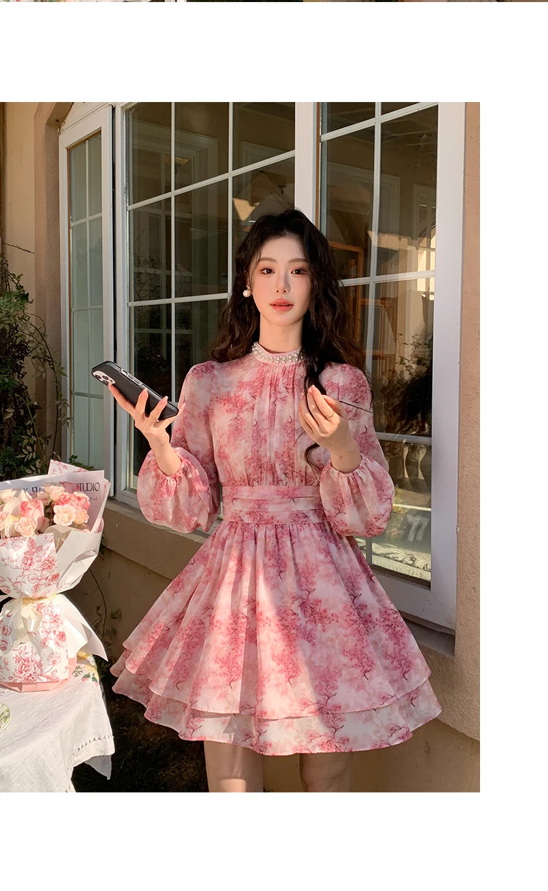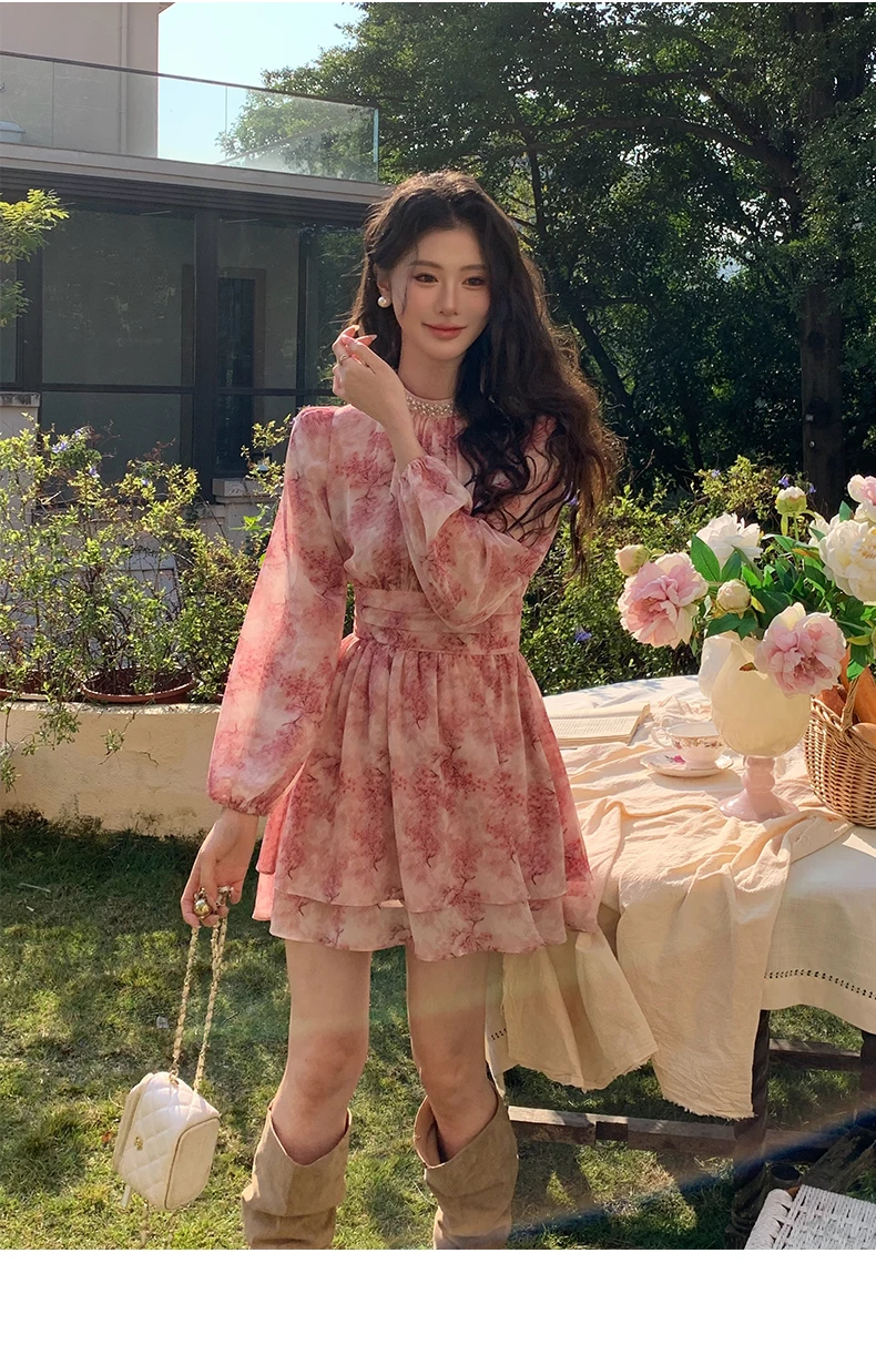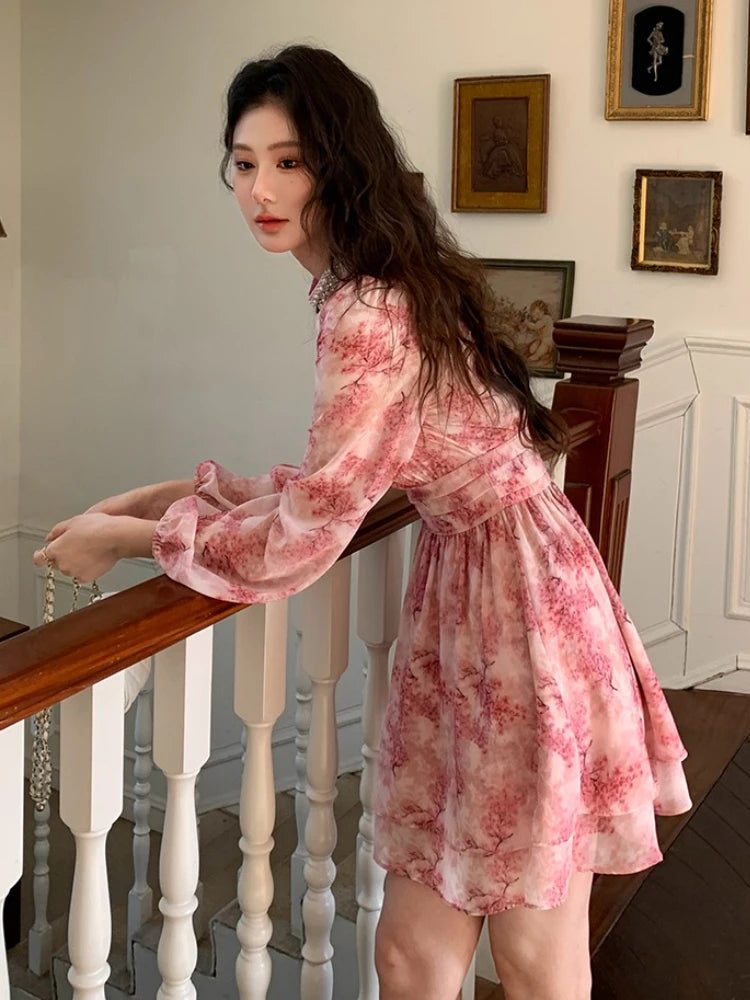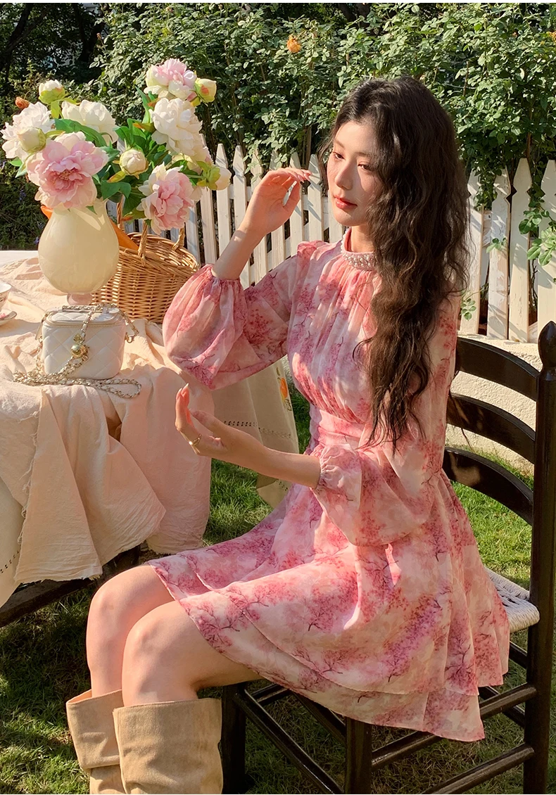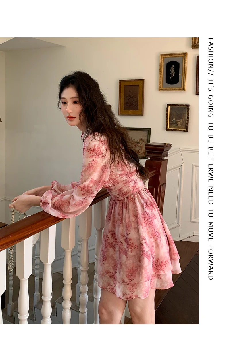 KYLETHOMASW - Women Street Clothes Sweet Chiffon Floral Print Puff Sleeve Slim Short Dress Elegant Party Birthday Vestidos Casual Summer New