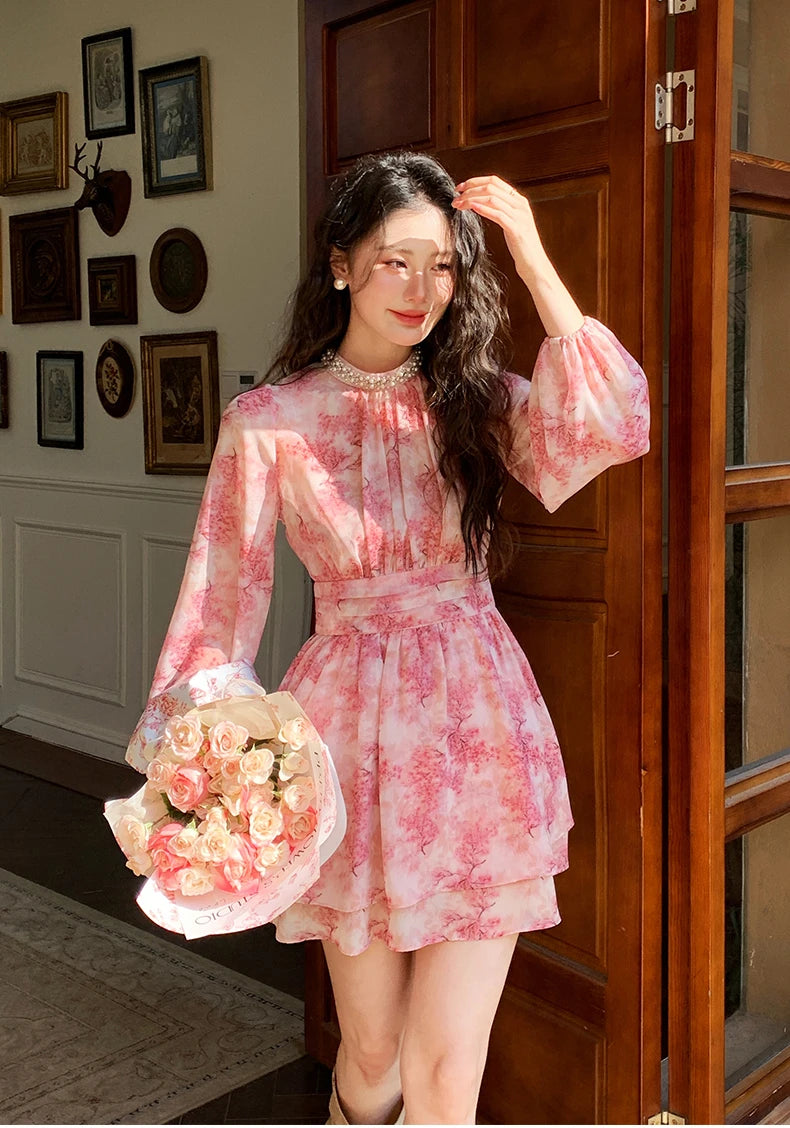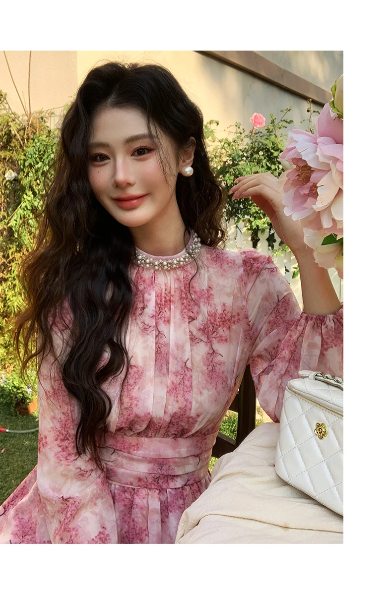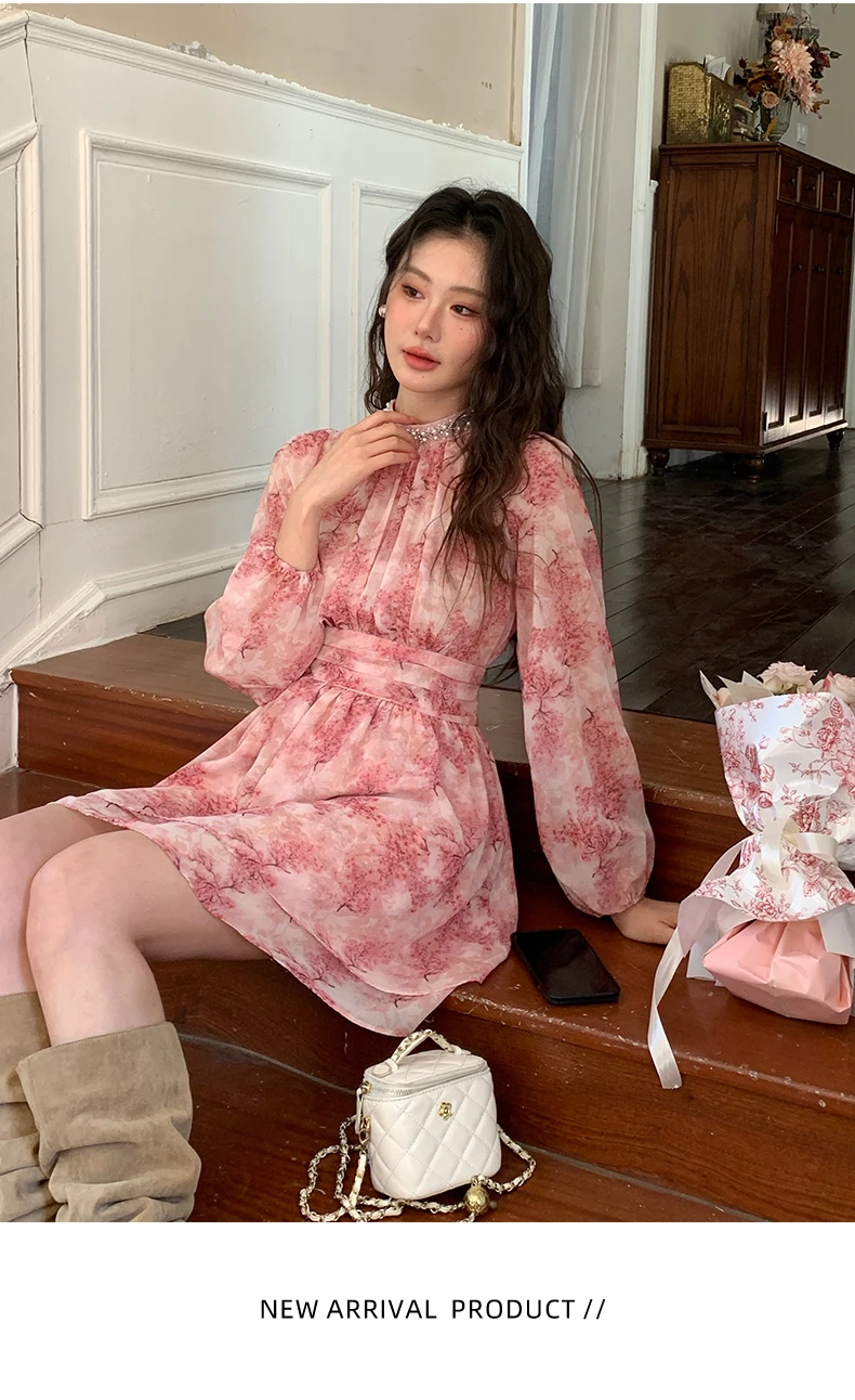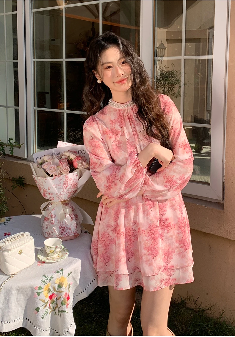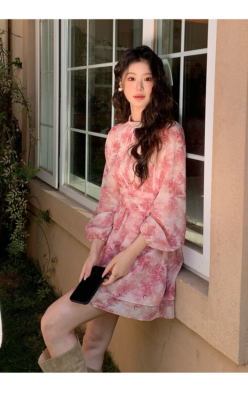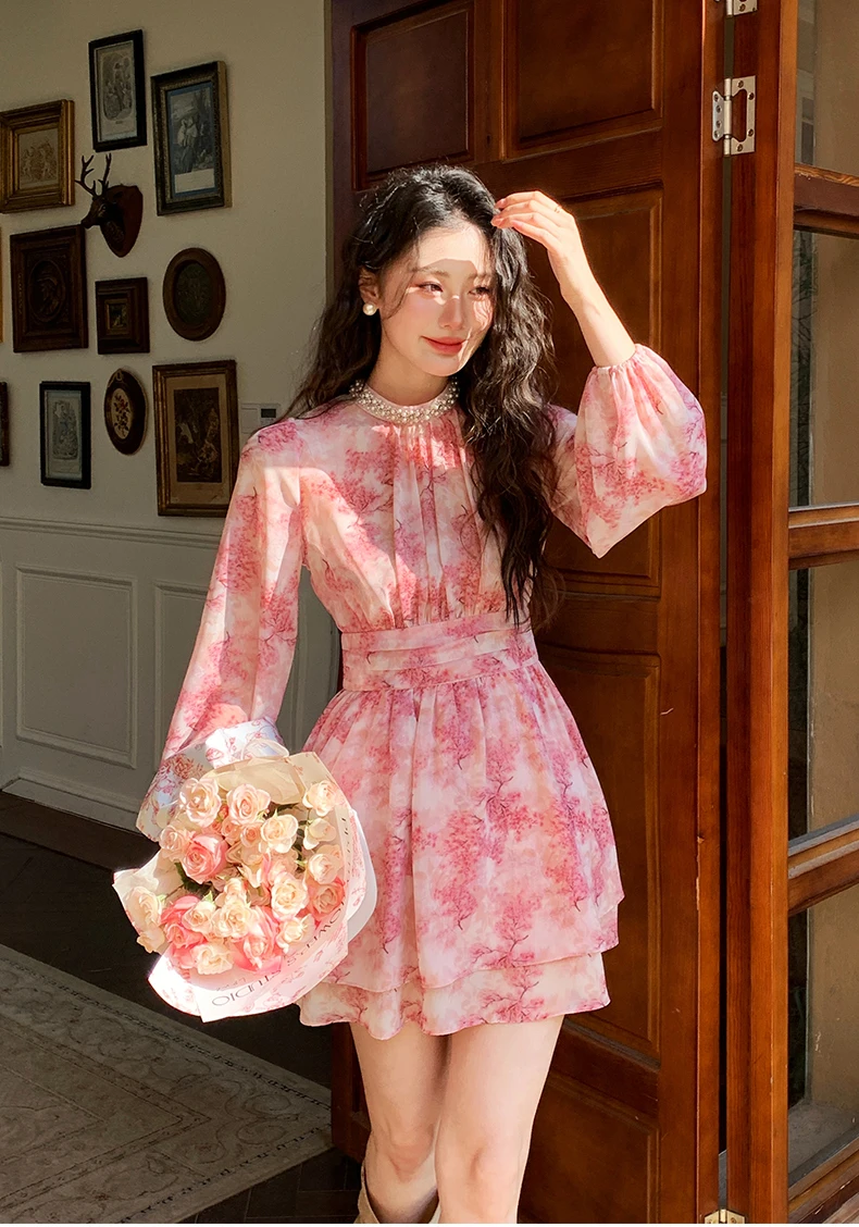 KYLETHOMASW - Women Street Clothes Sweet Chiffon Floral Print Puff Sleeve Slim Short Dress Elegant Party Birthday Vestidos Casual Summer New