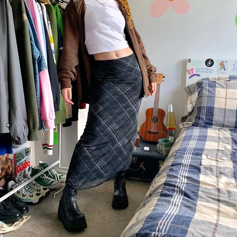 KYLETHOMASW  -  Women's Casual Maxi Dress, Vintage Black Plaid Aesthetic Print Pattern High Waist Fit Dress, Casual Streetwear