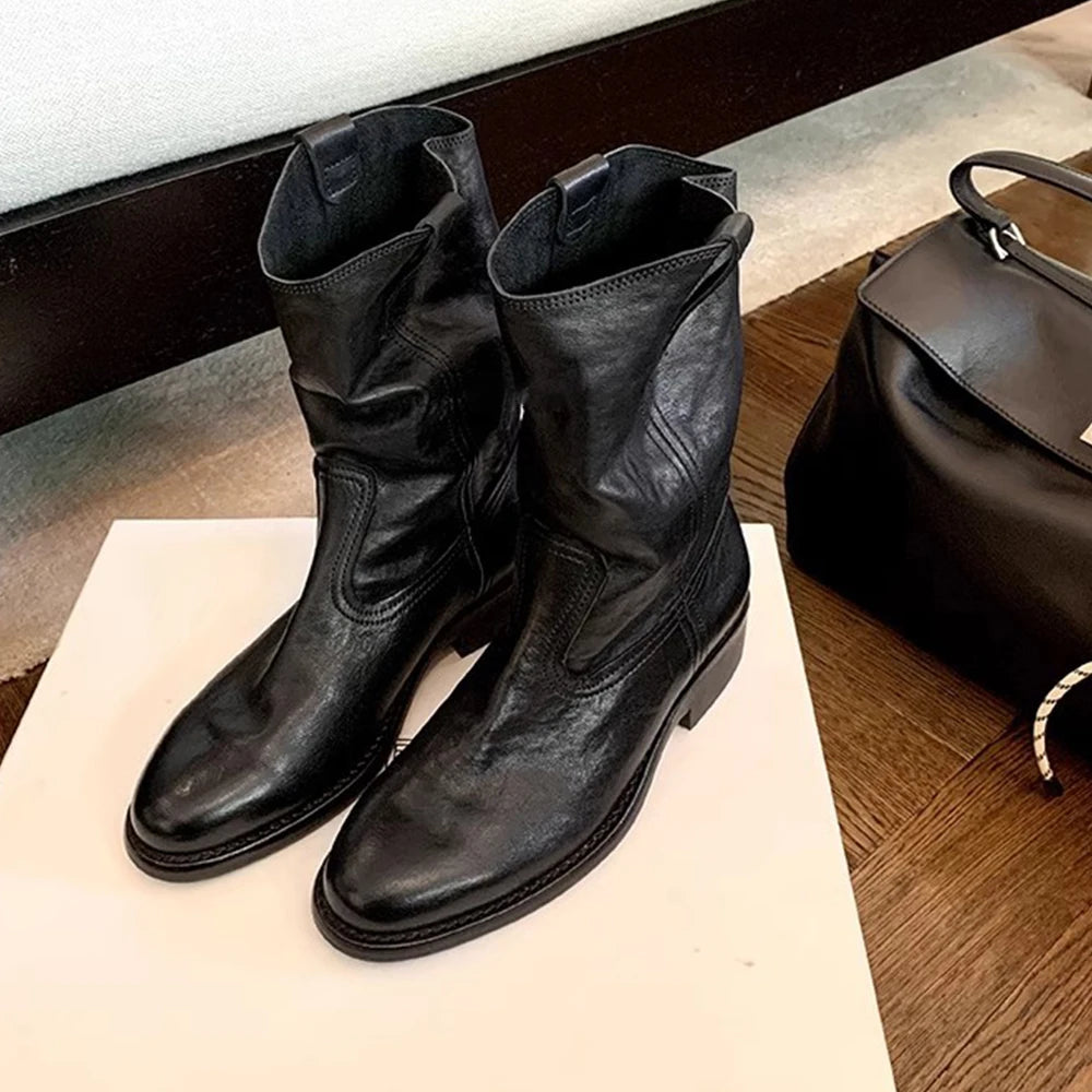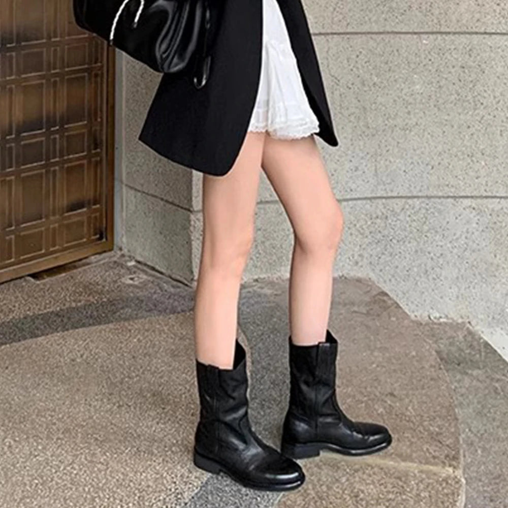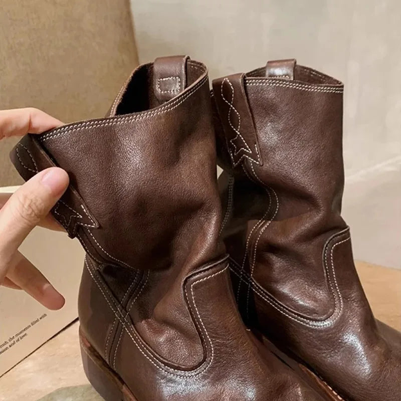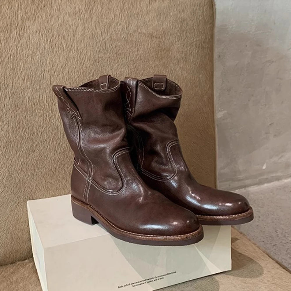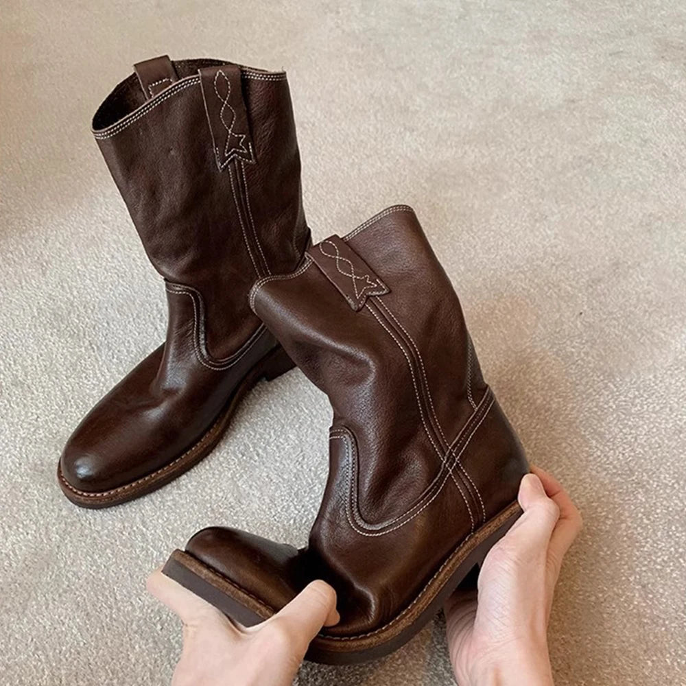 KYLETHOMASW - Women's Cowboy Boots Mid Calf Boots Western Short Embroidered Round Toe Low Heel Slip on Comfort Dress Slouchy Booties