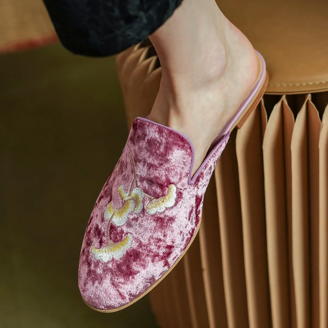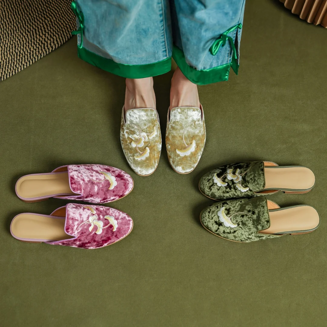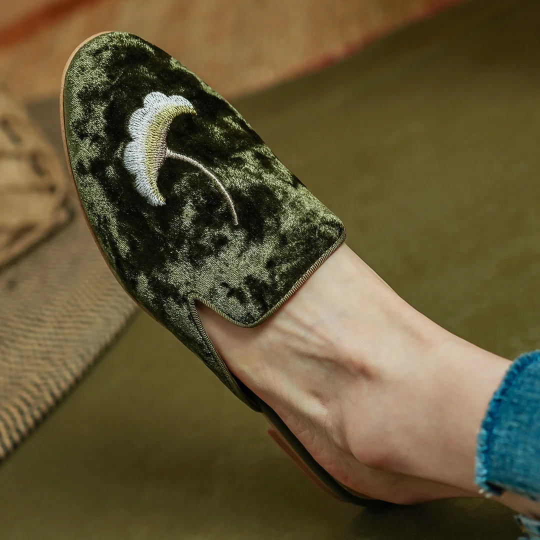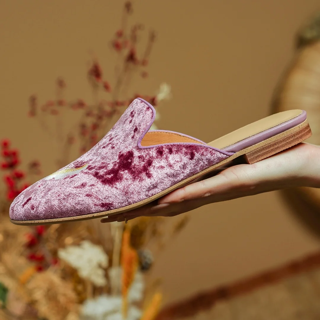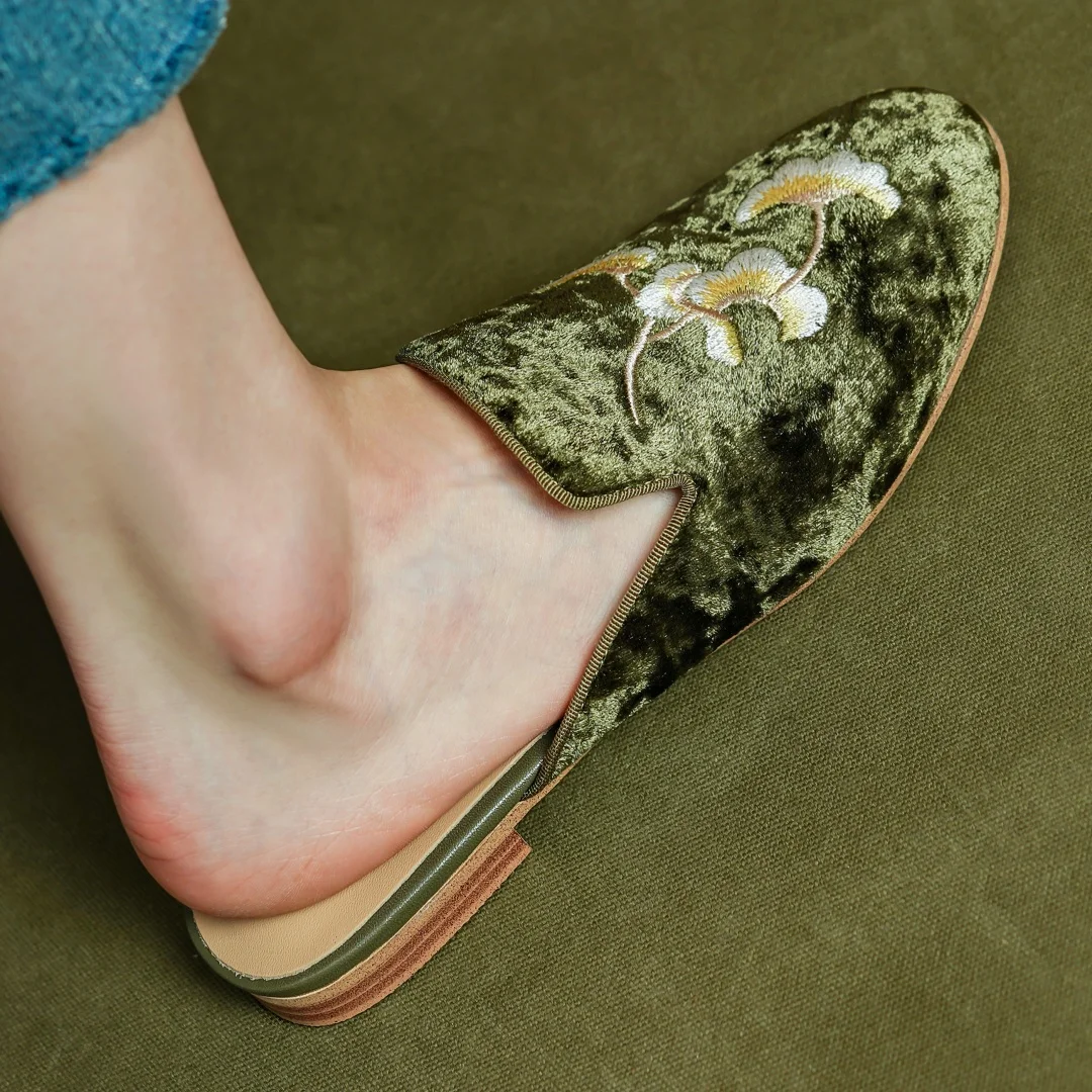 KYLETHOMASW - Women's embroidery velvet slip-on flats summer mules round toe pigskin inside sheepskin insole casual female sandals shoes woman