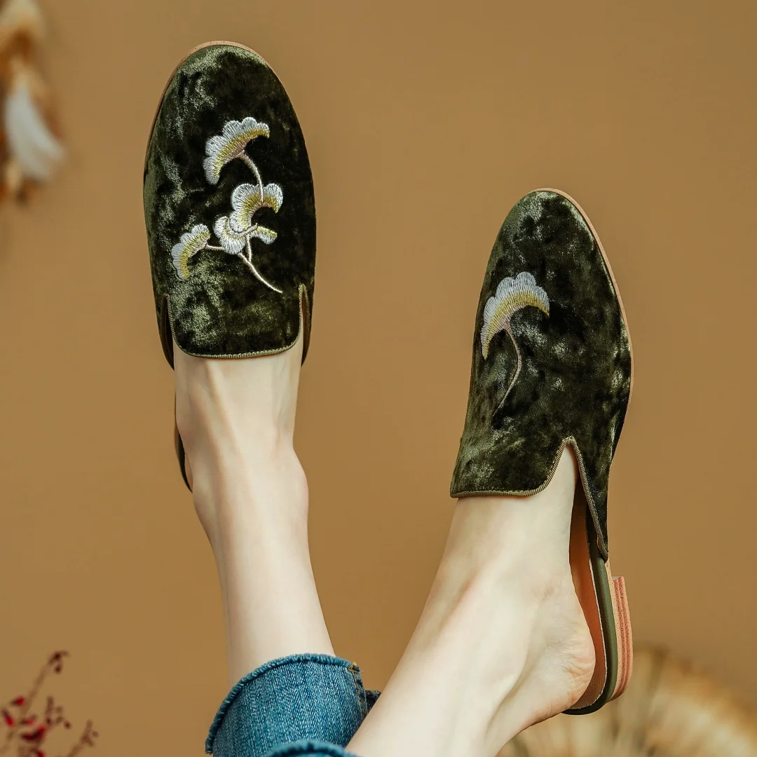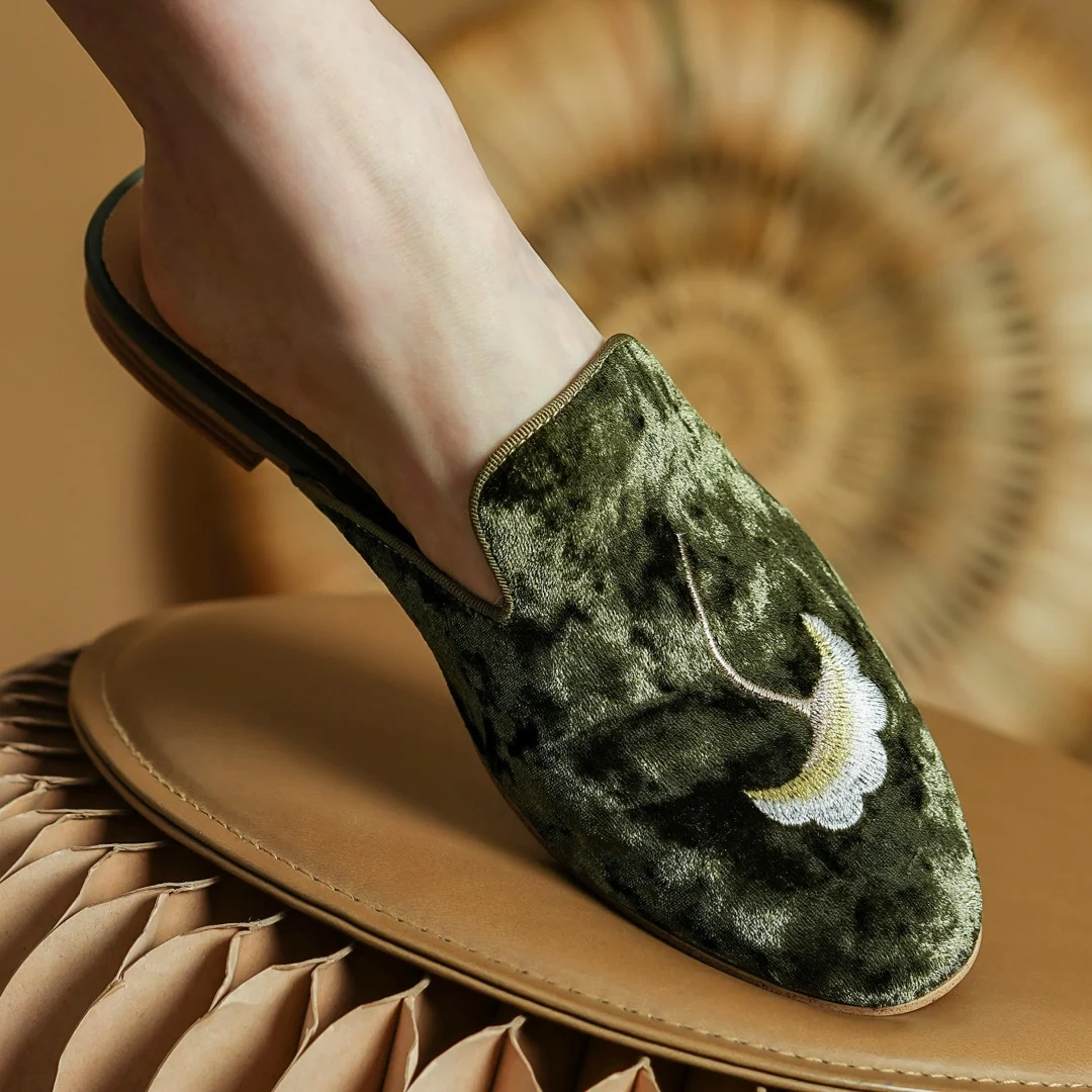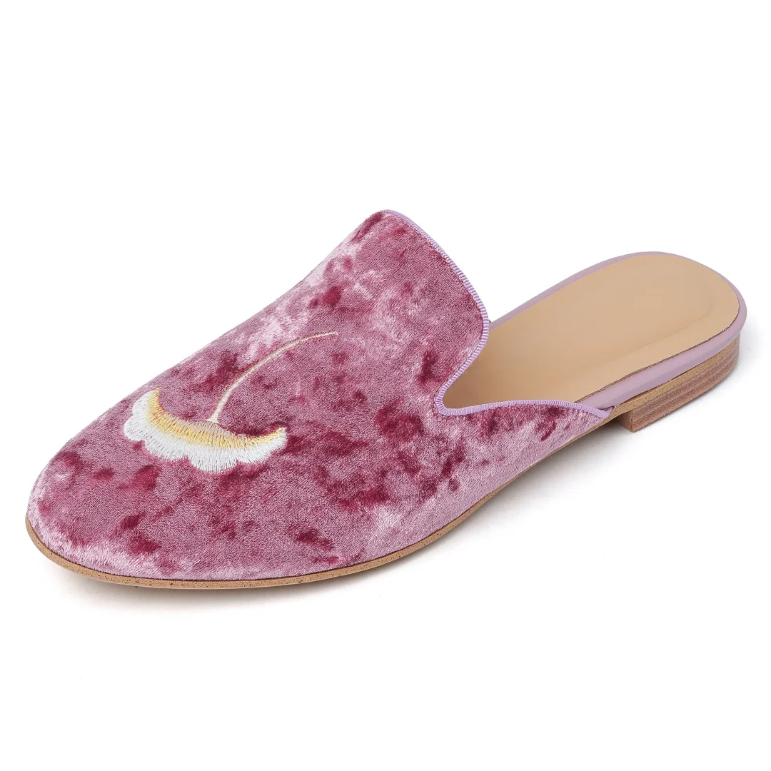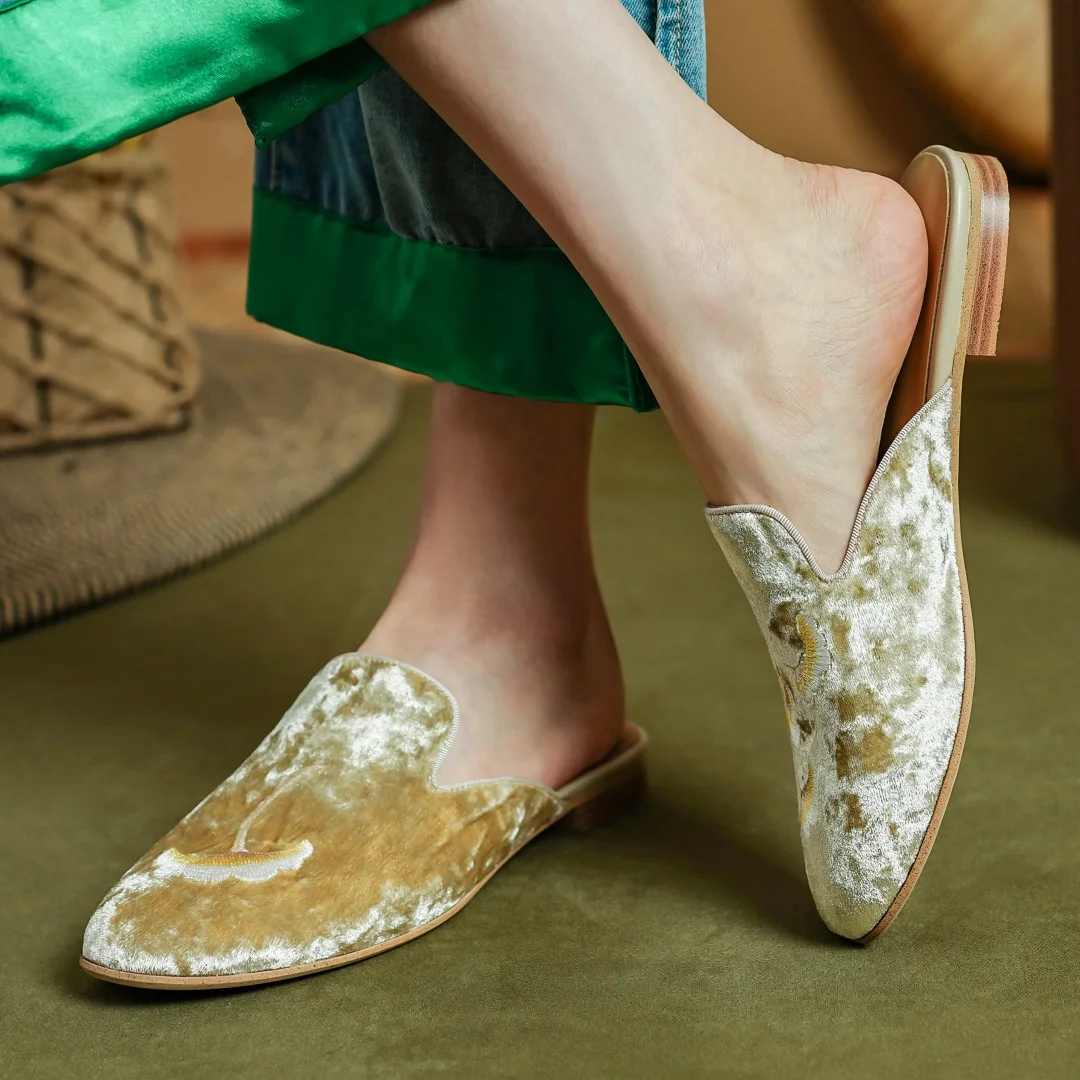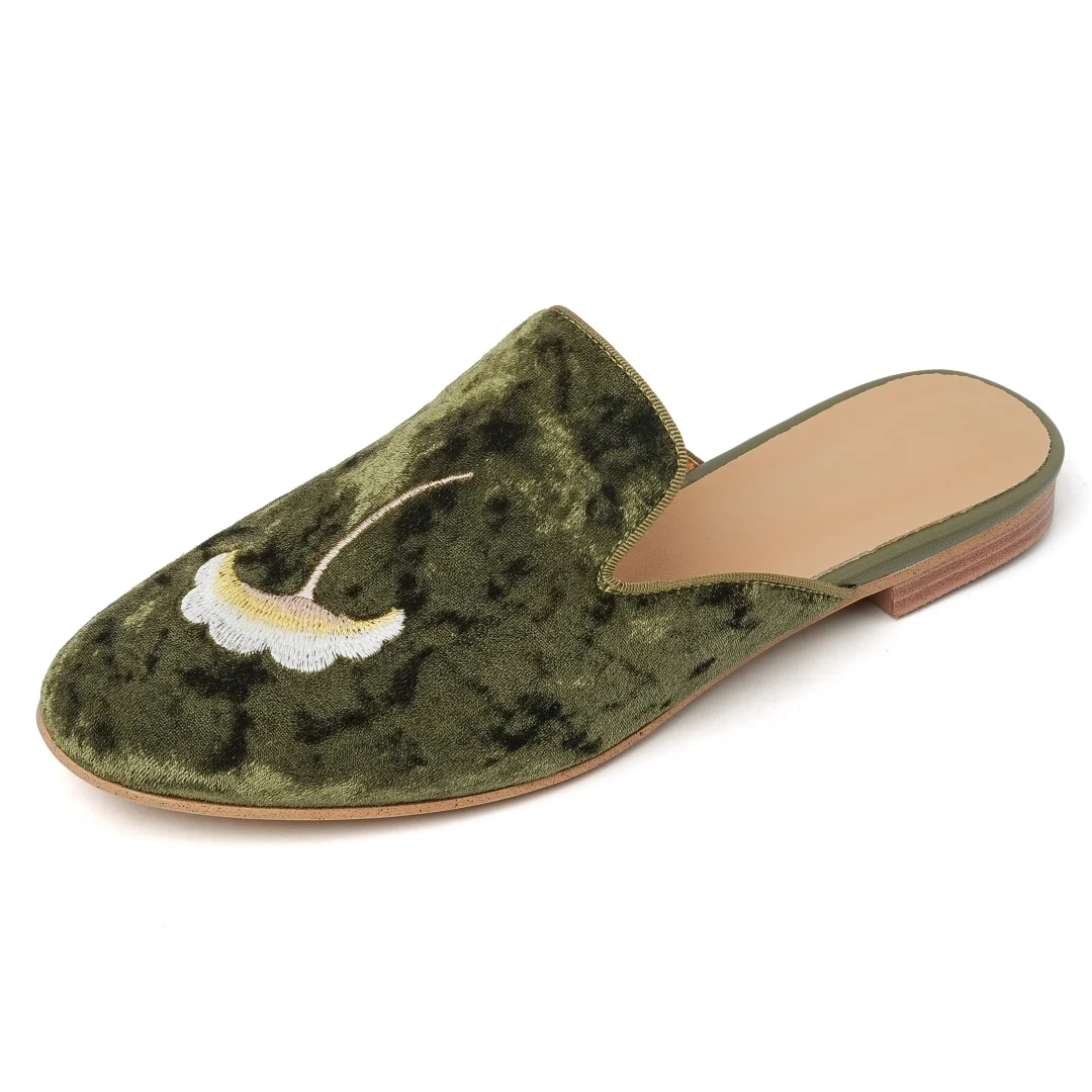 KYLETHOMASW - Women's embroidery velvet slip-on flats summer mules round toe pigskin inside sheepskin insole casual female sandals shoes woman