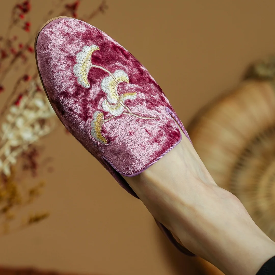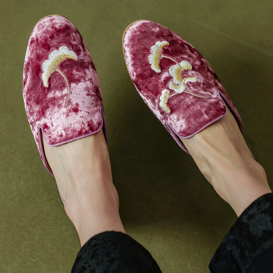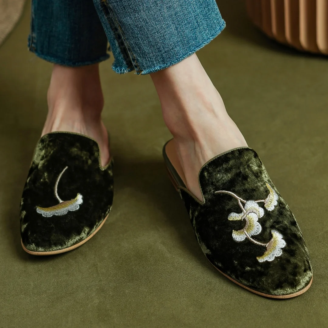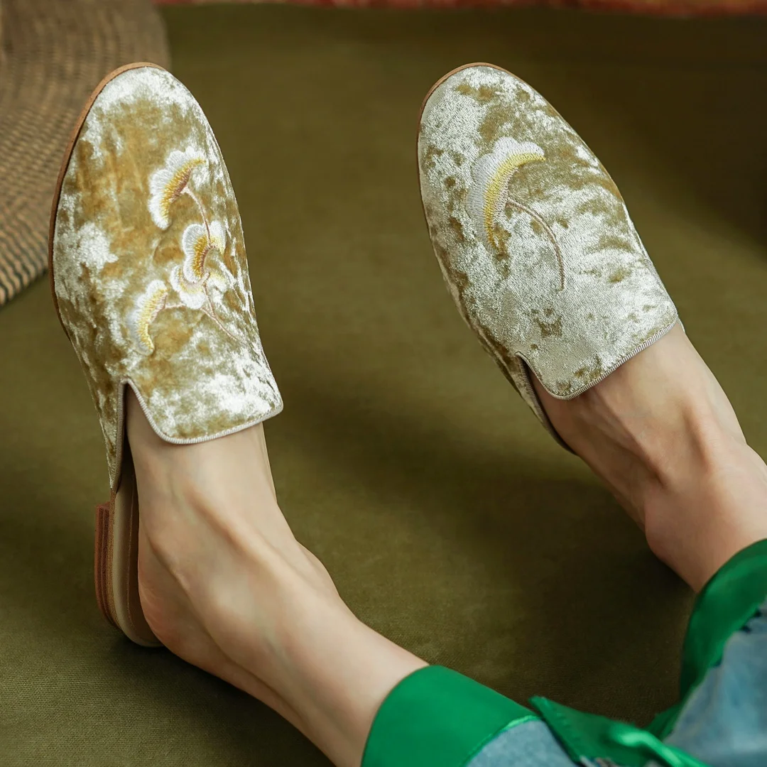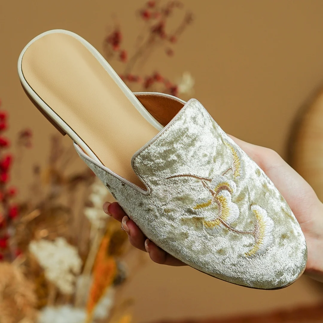 KYLETHOMASW - Women's embroidery velvet slip-on flats summer mules round toe pigskin inside sheepskin insole casual female sandals shoes woman