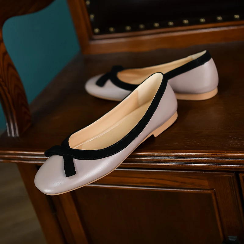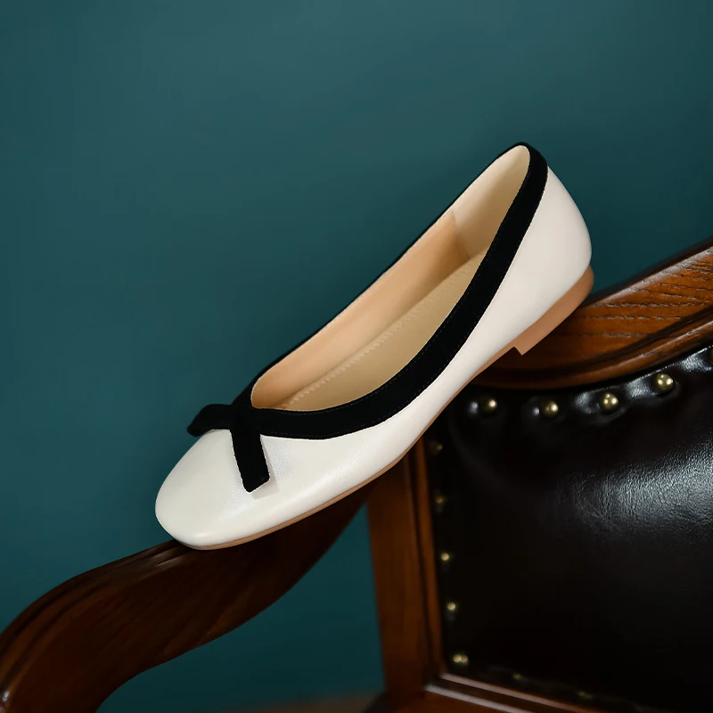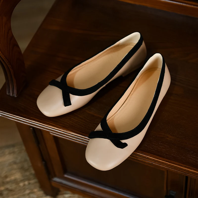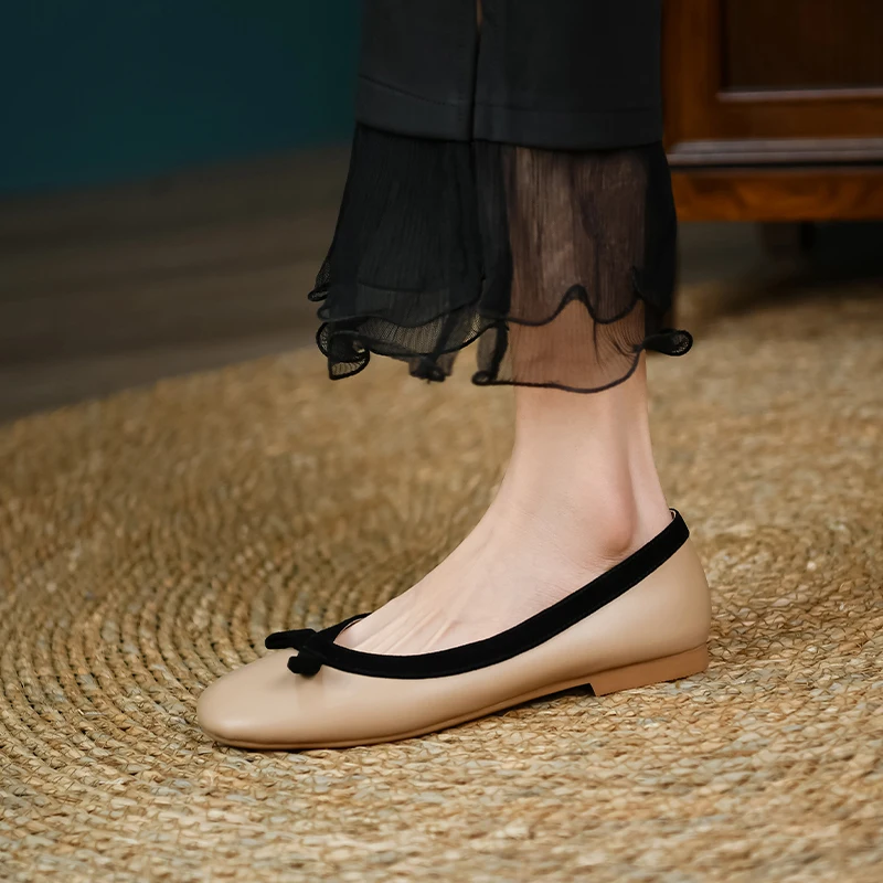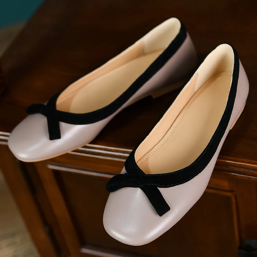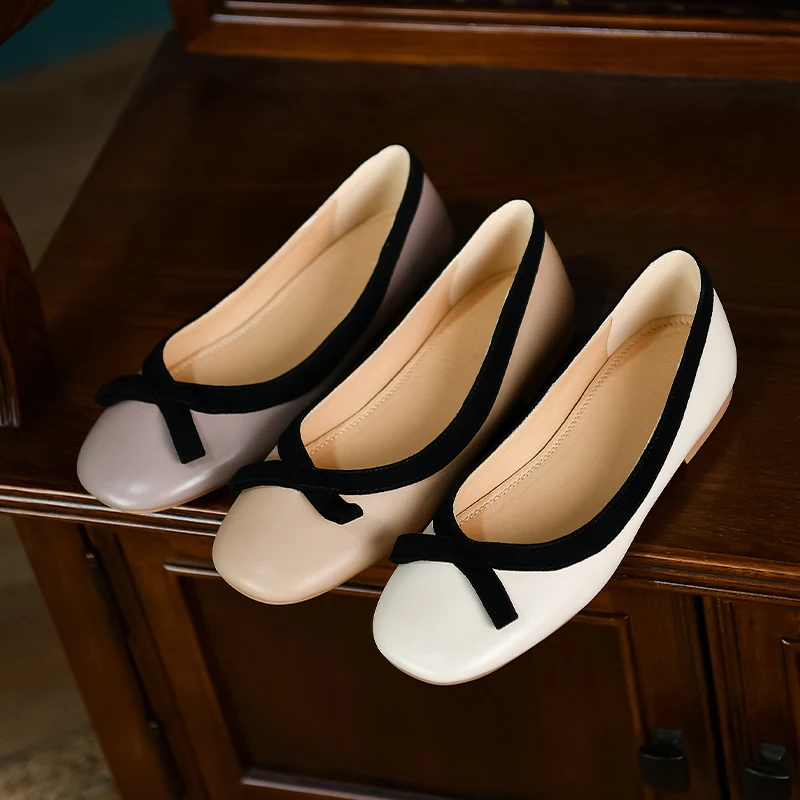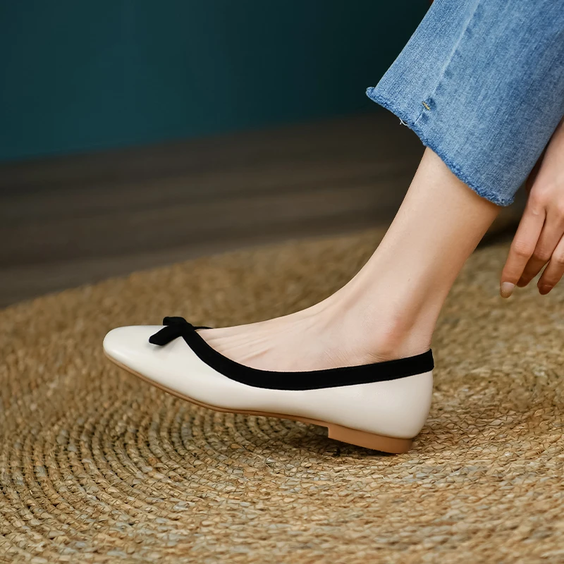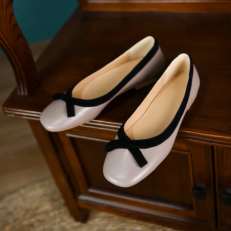 KYLETHOMASW - Women's genuine leather bordered slip-on ballet flats square toe sweet bowtie korean style female ballerians soft casual shoes