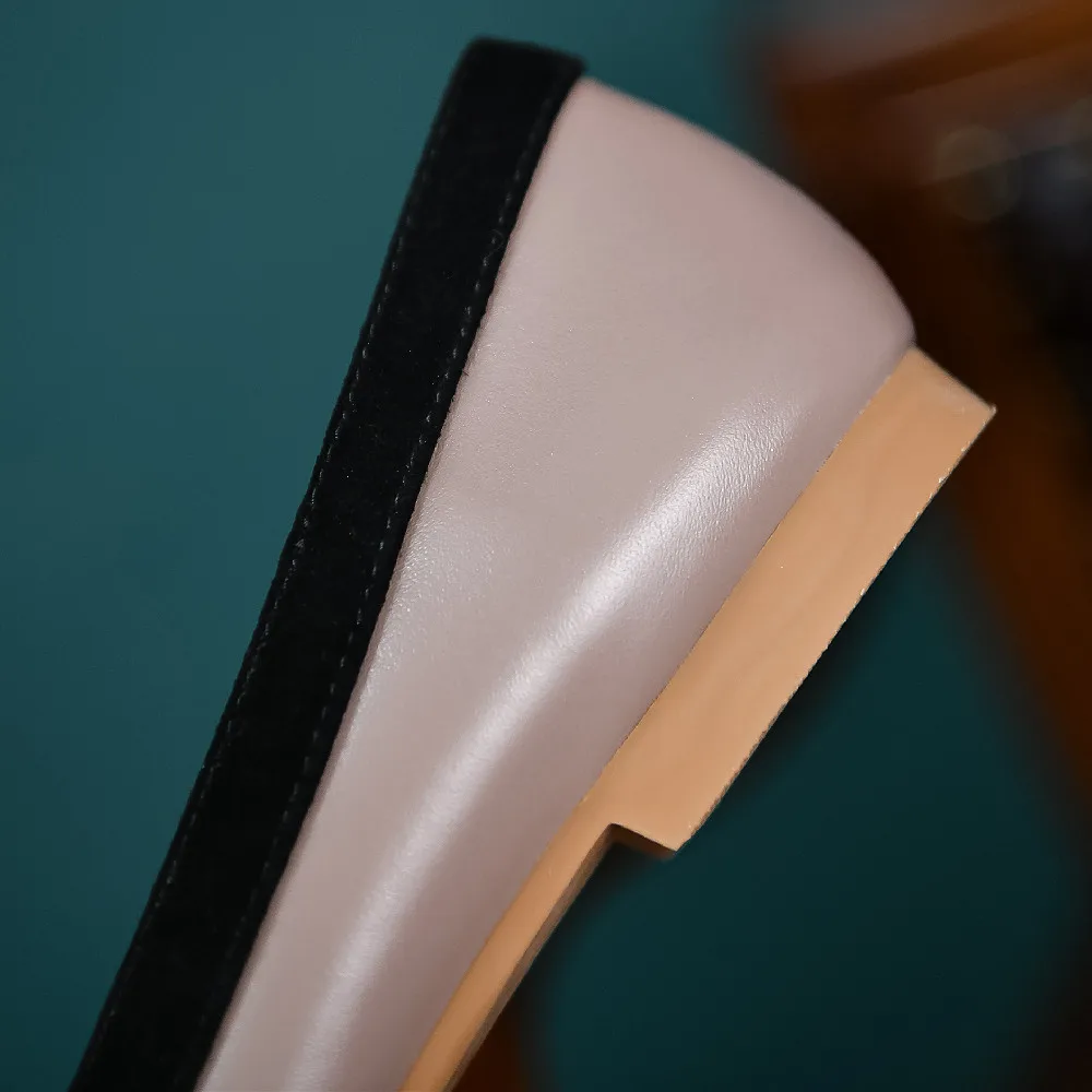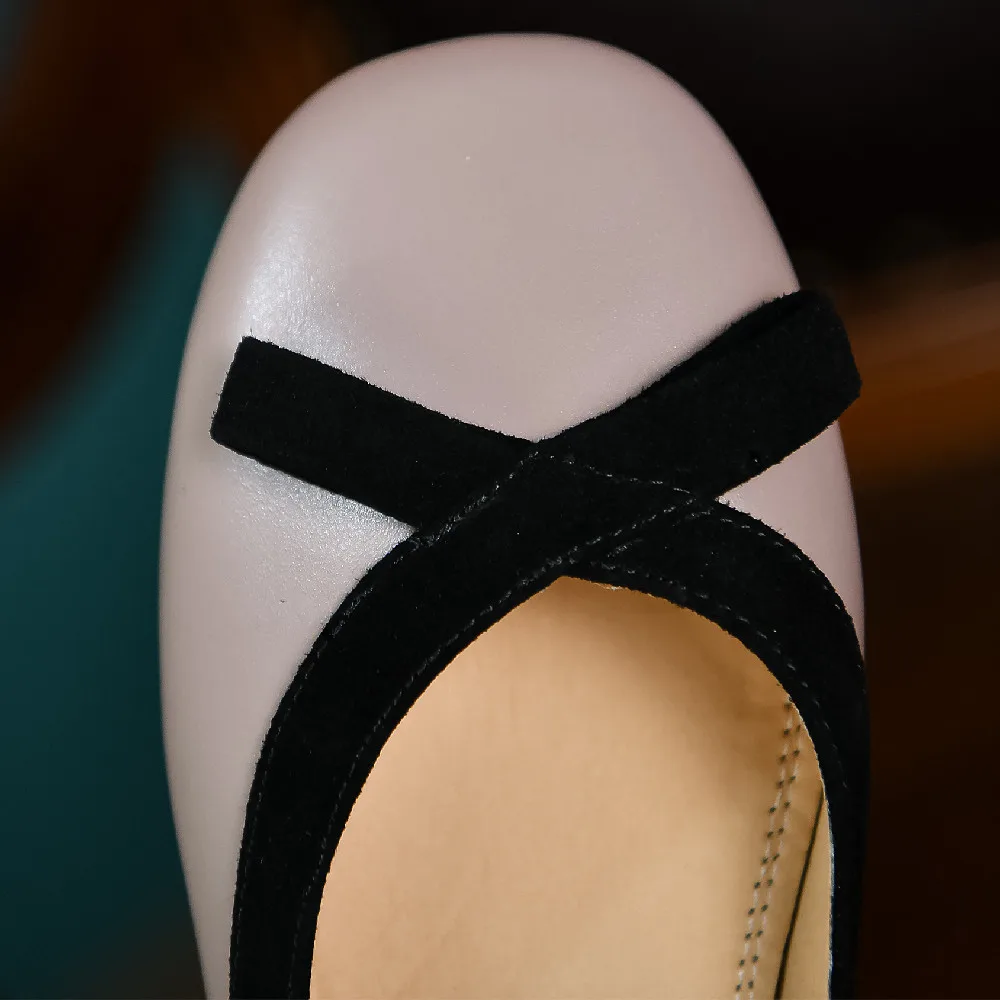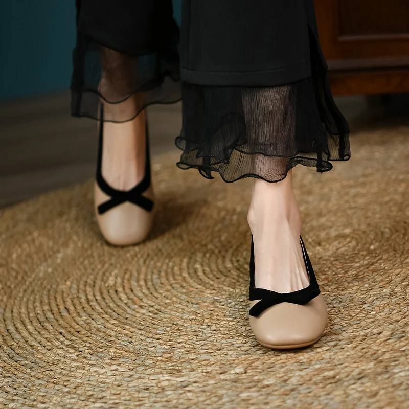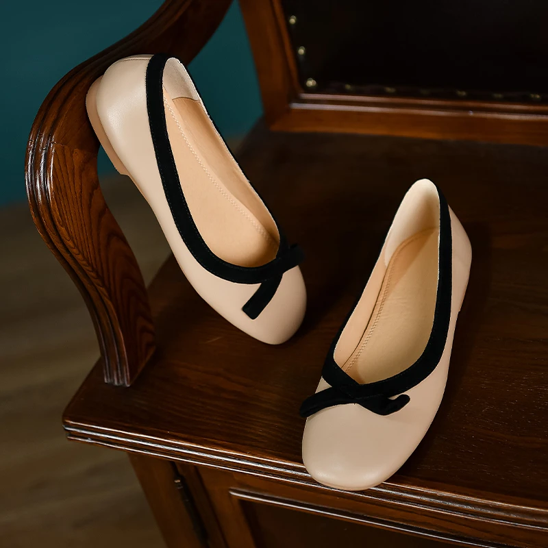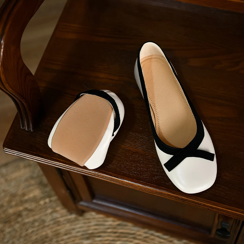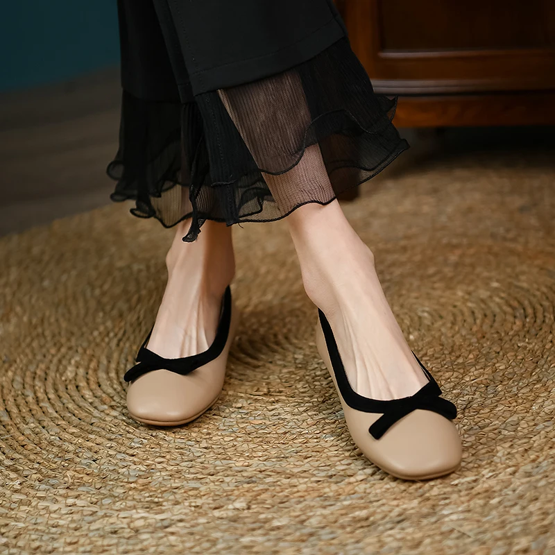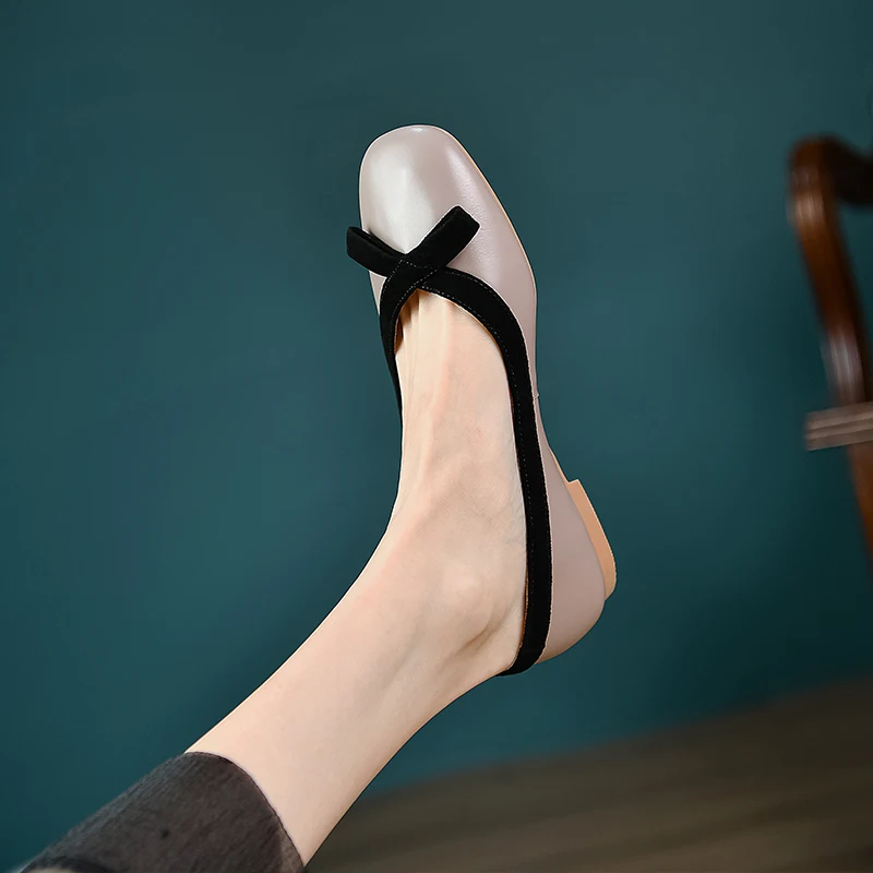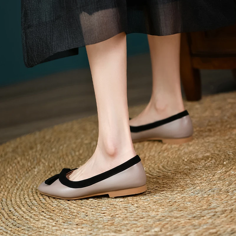 KYLETHOMASW - Women's genuine leather bordered slip-on ballet flats square toe sweet bowtie korean style female ballerians soft casual shoes