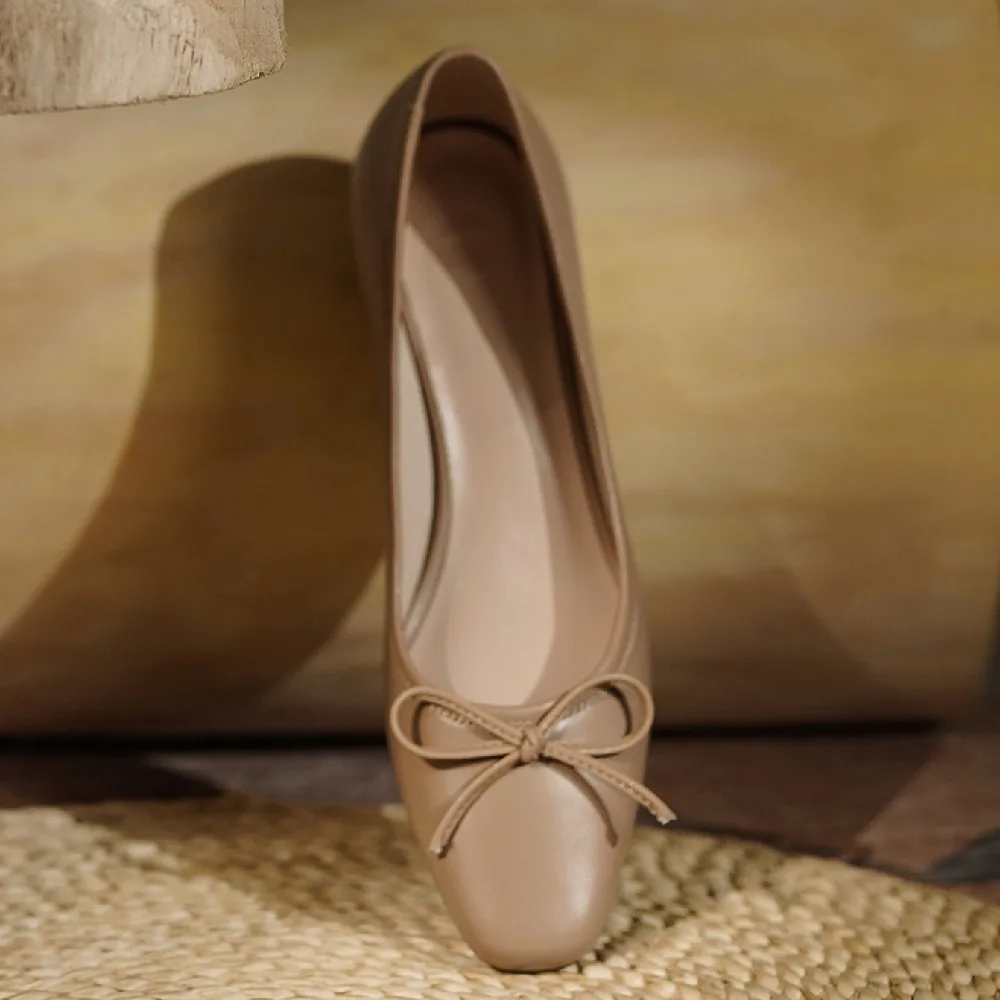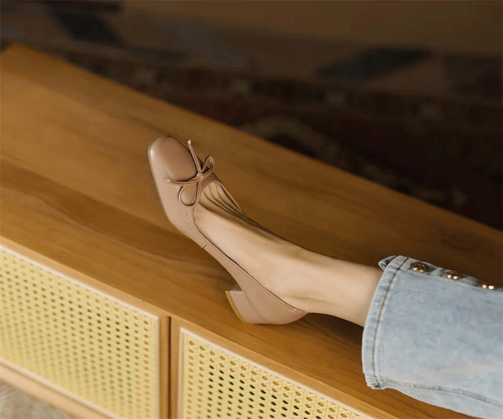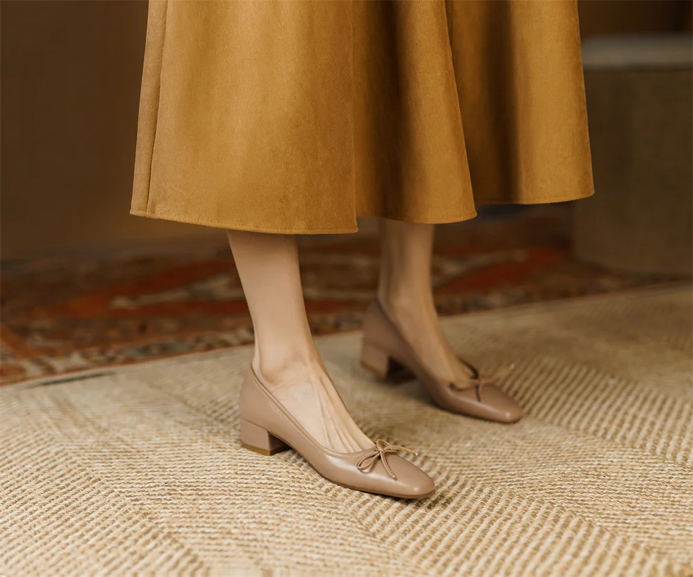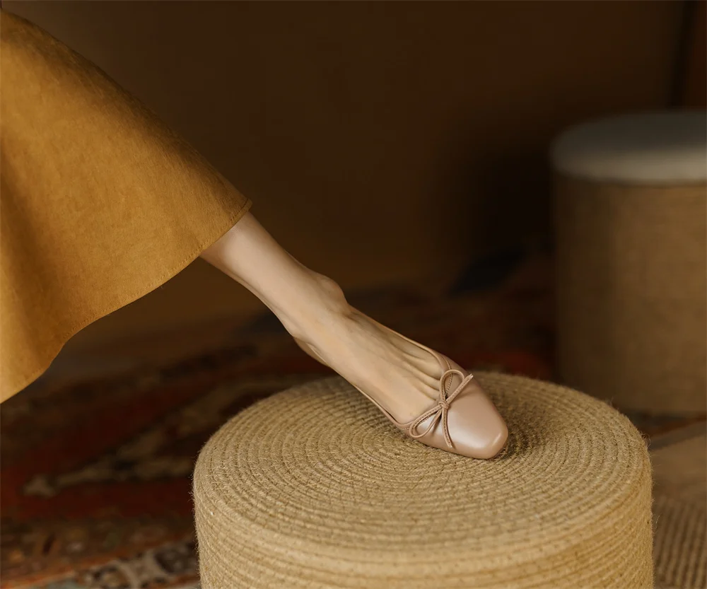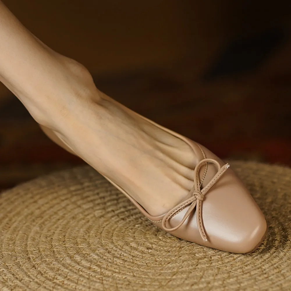 KYLETHOMASW - Women's genuine leather square toe slip-on flats daily shoes for women sweet bowtie casual ladies korean style shoes for women