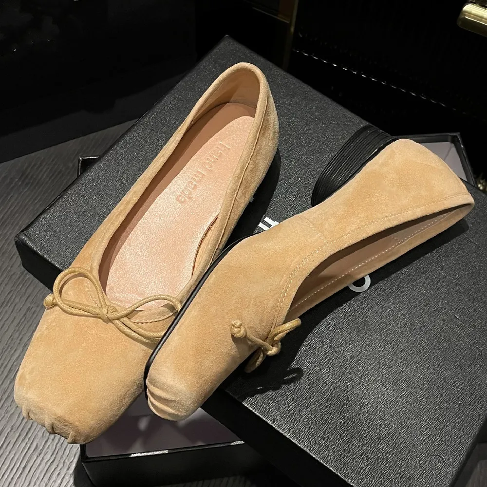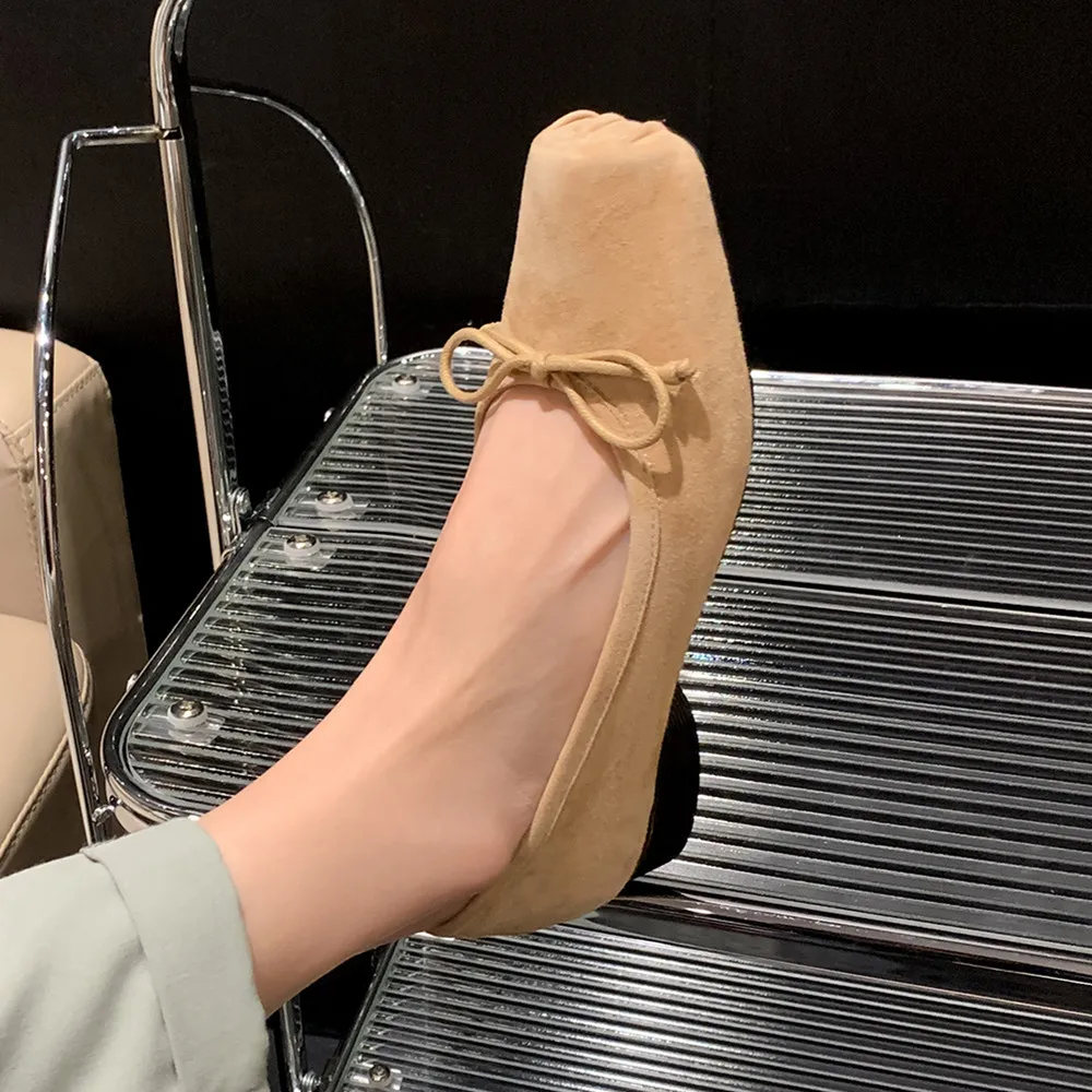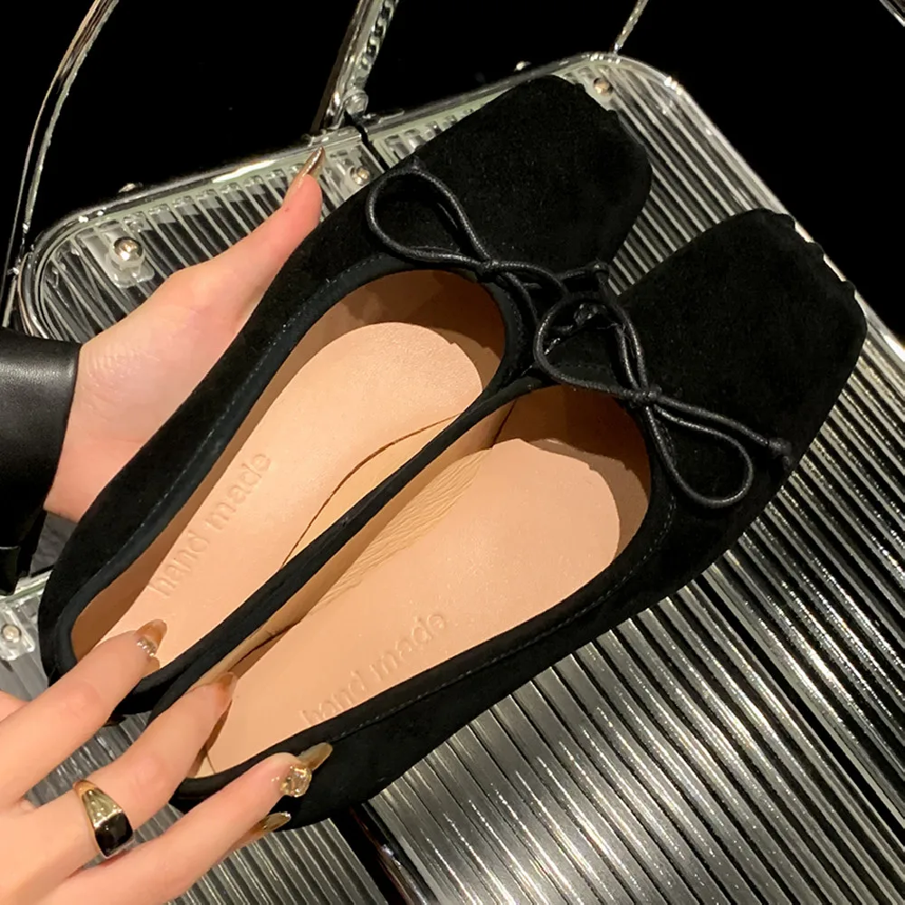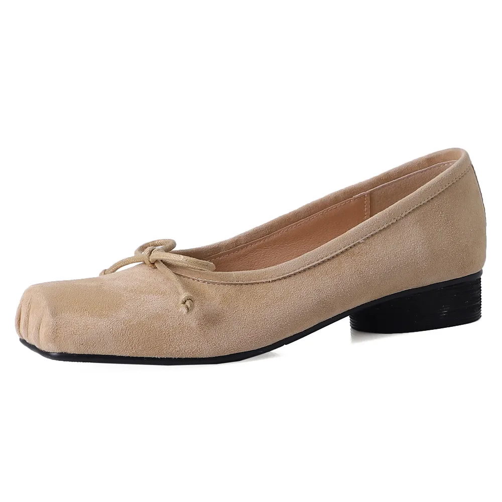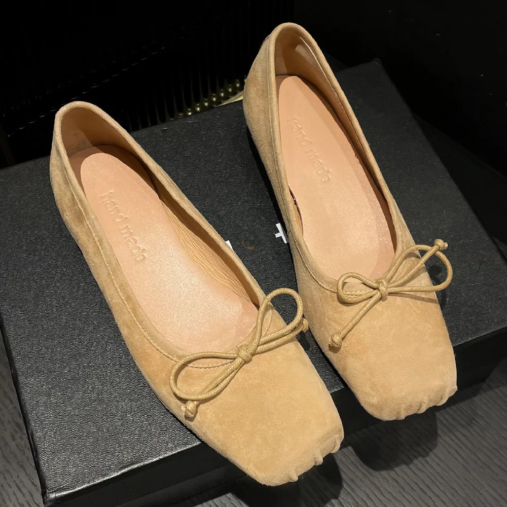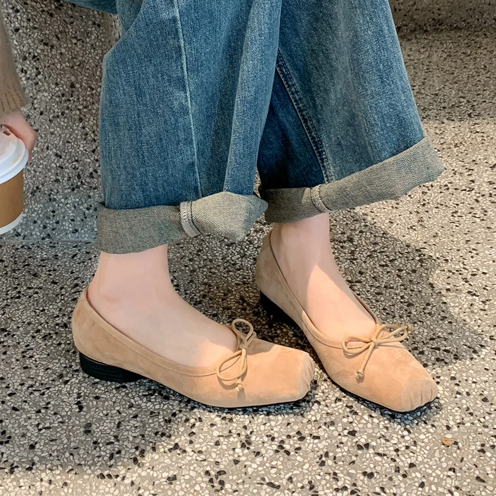 Kylethomasw - Women's natural suede leather square toe slip-on ballet flats sweet bowtie casual female ballerians soft comfort shoes for women