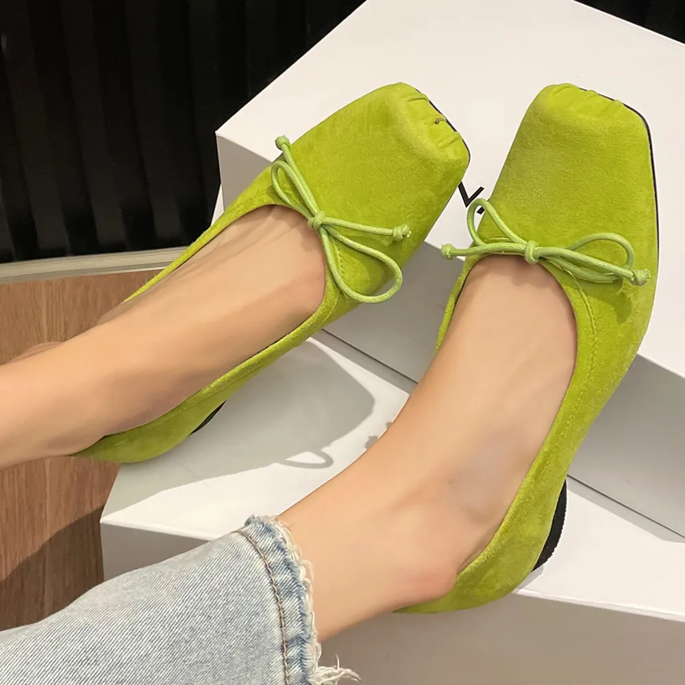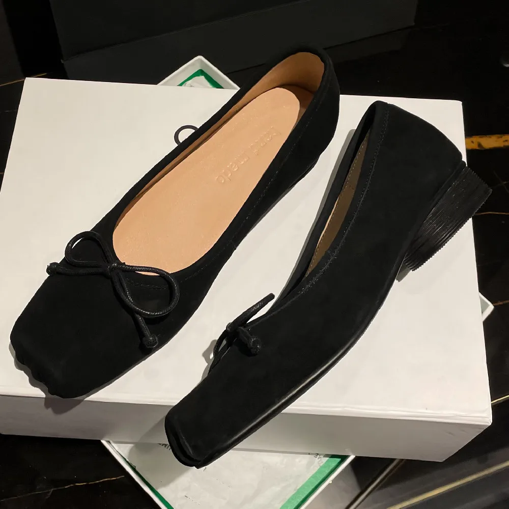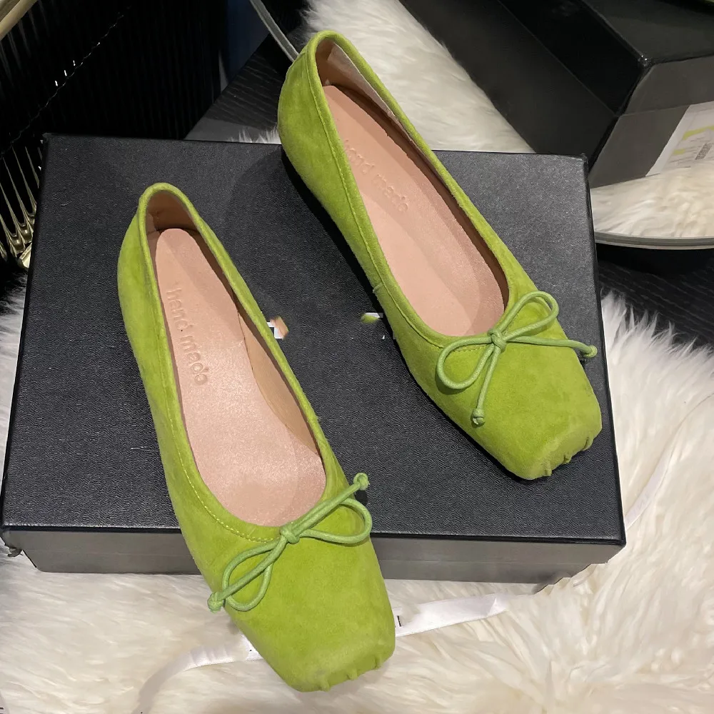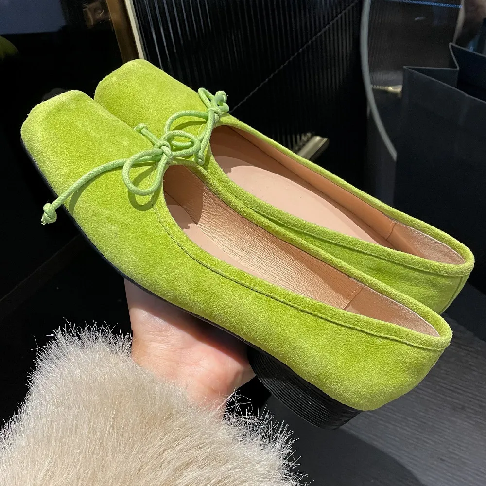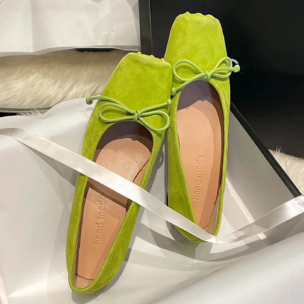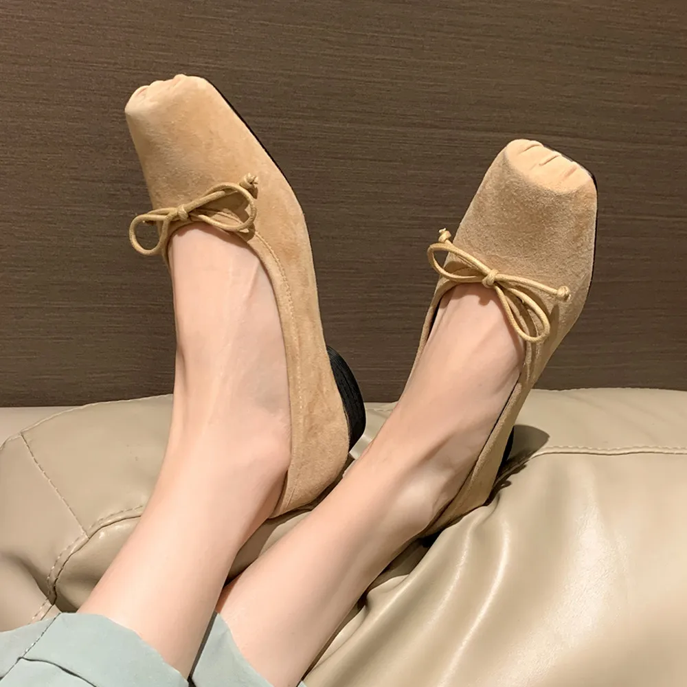 Kylethomasw - Women's natural suede leather square toe slip-on ballet flats sweet bowtie casual female ballerians soft comfort shoes for women