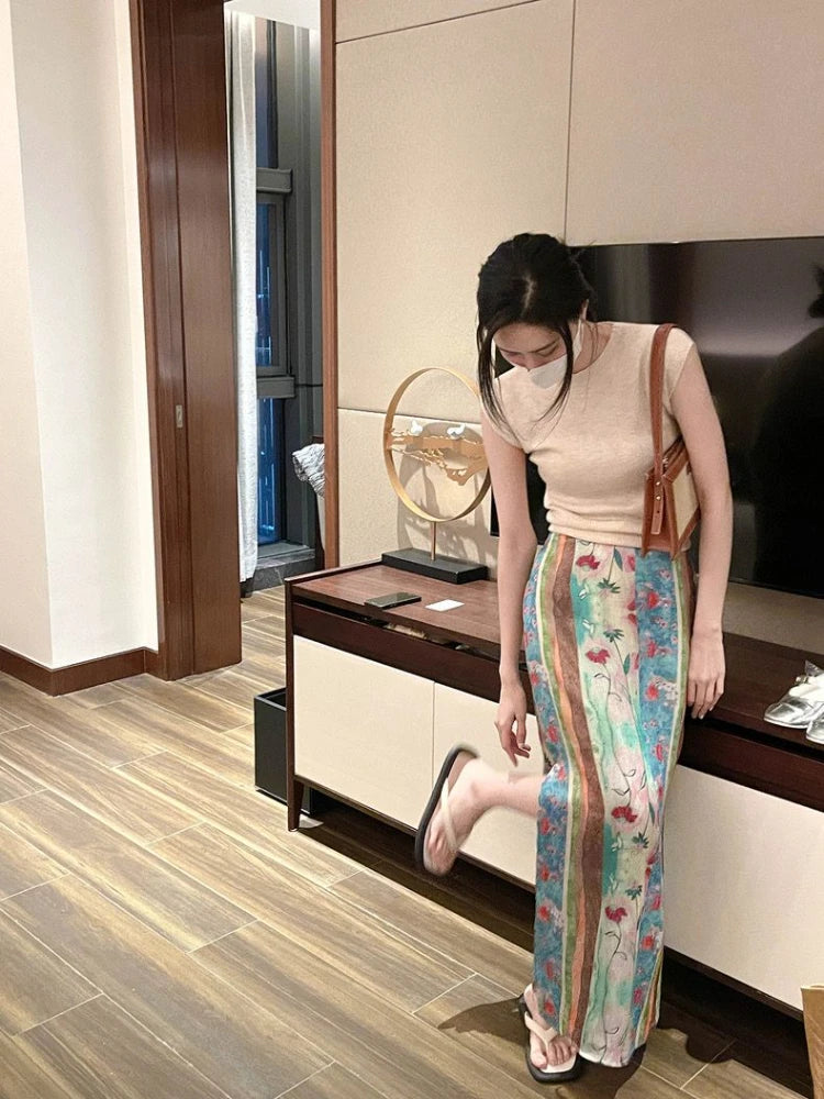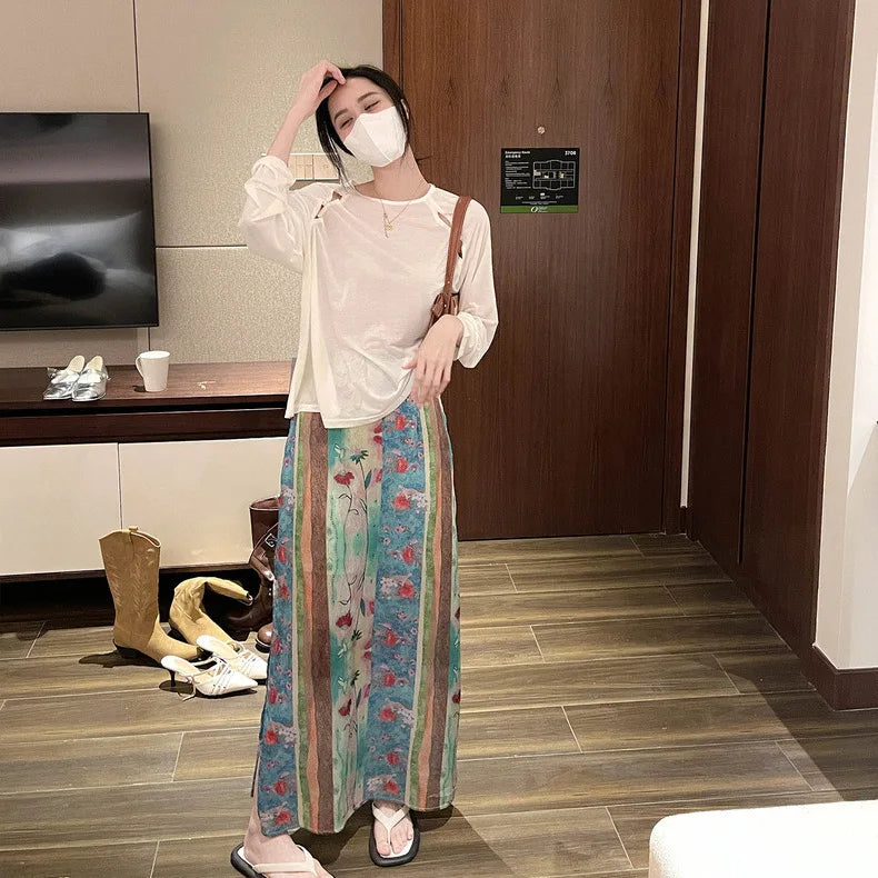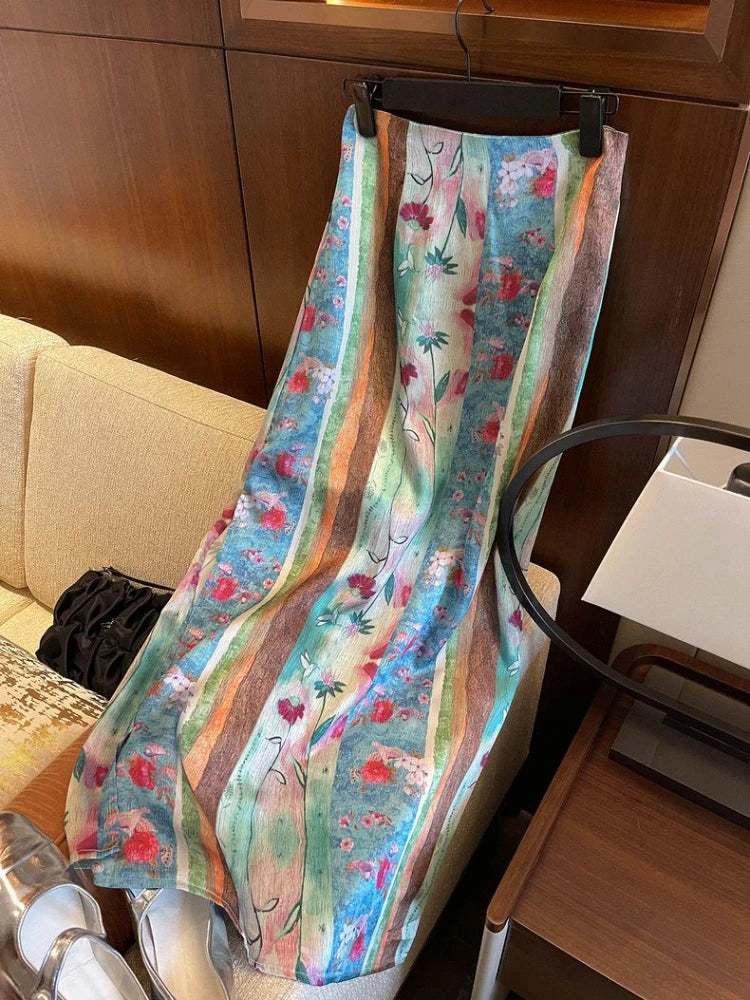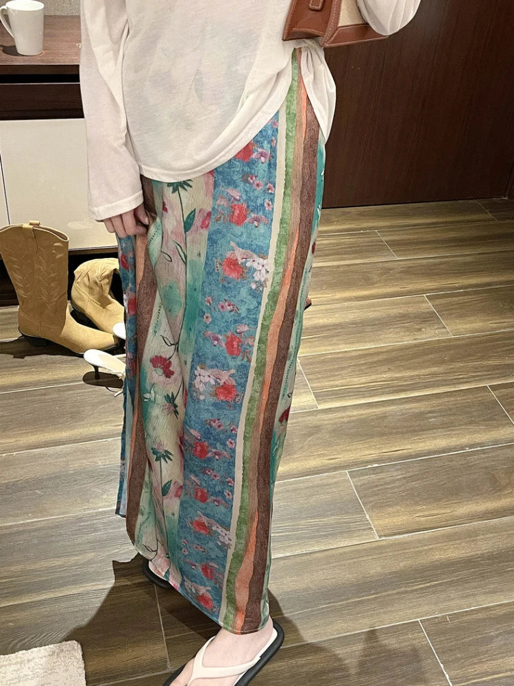 KYLETHOMASW - Y2k Streetwear New Chinese Glass Oil Painting Long Skirt Slit Vintage Temperament Skirts for Woman Korean Fashion Faldas
