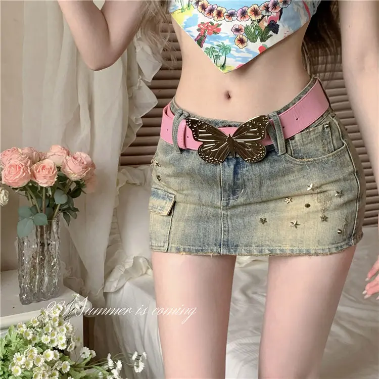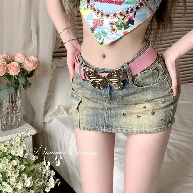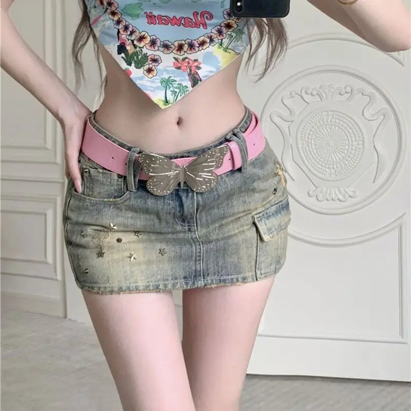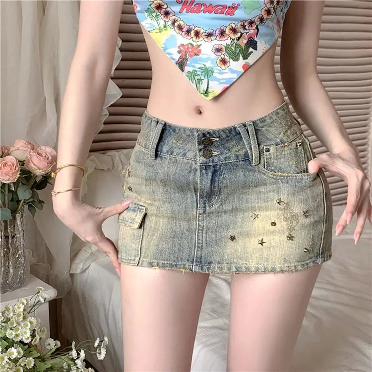 Kylethomasw - Y2K Vintage Willow Nail Heavy Industry Denim Skirt Women's Summer New Low Waist Sexy Wrapped Hip Short Skirt