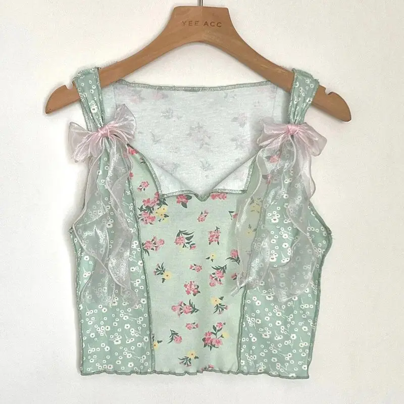 KYLTHOMASW - Bow Y2k Aesthetic Sweet Printing Women Crop Top Streetwear Grunge Slim Tanks Tops Vintage Patchwork Harajuku Camisoles Summer