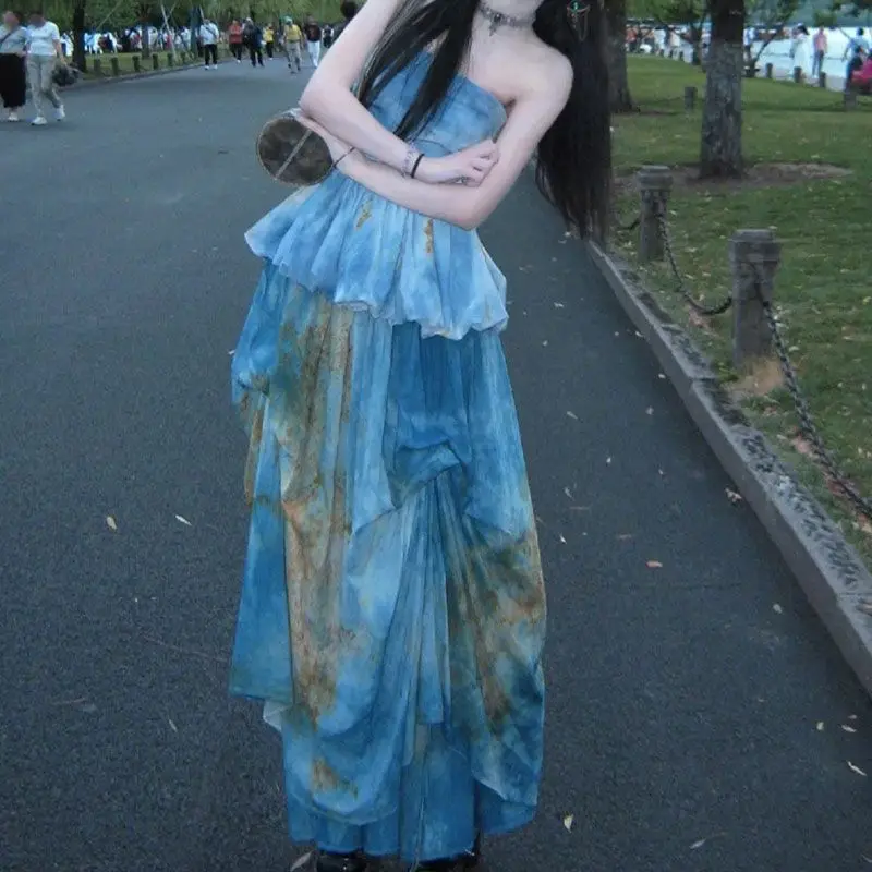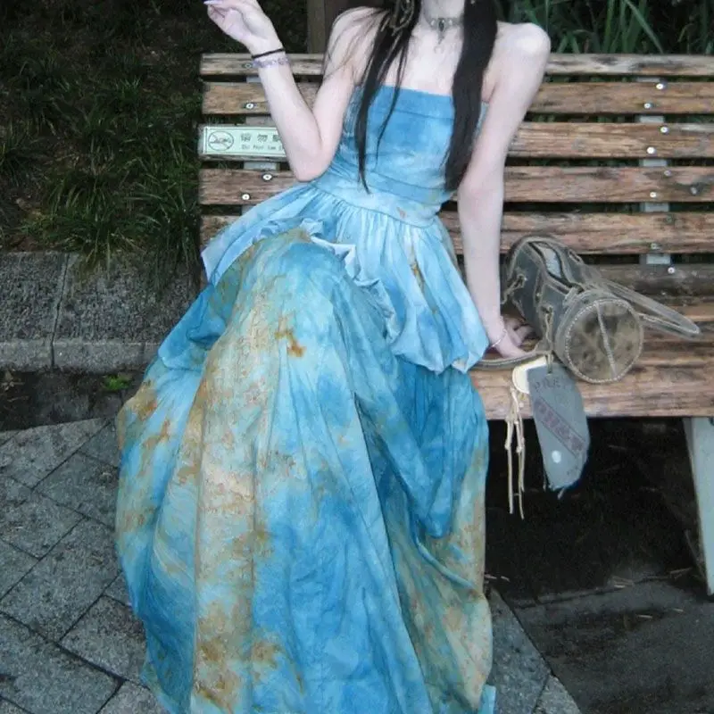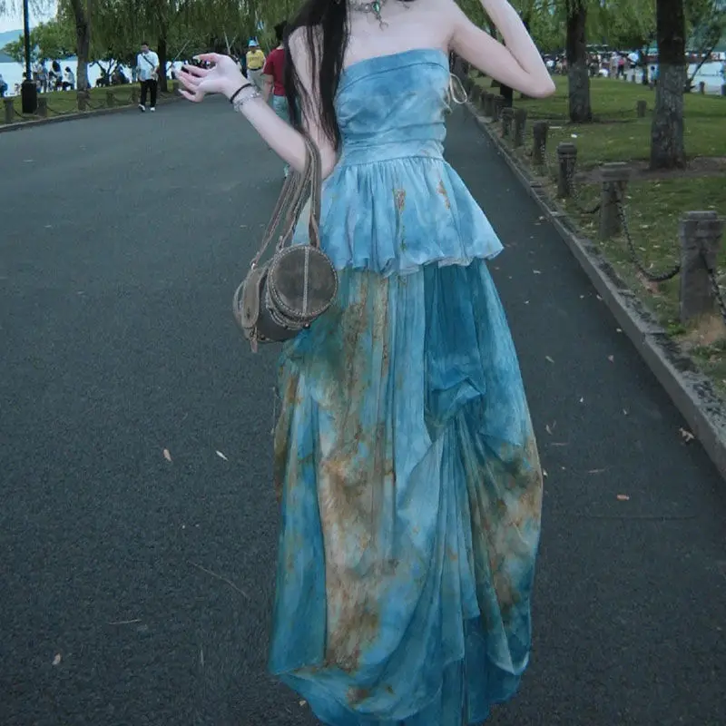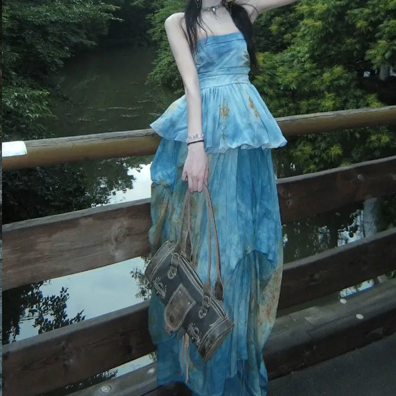 KYLTHOMASW - New Chinese Style Retro Skirts Set Summer New Retro Fashion Blue Gradient Sleeveless Top Long Skirt Two Piece Sets Women Outfits