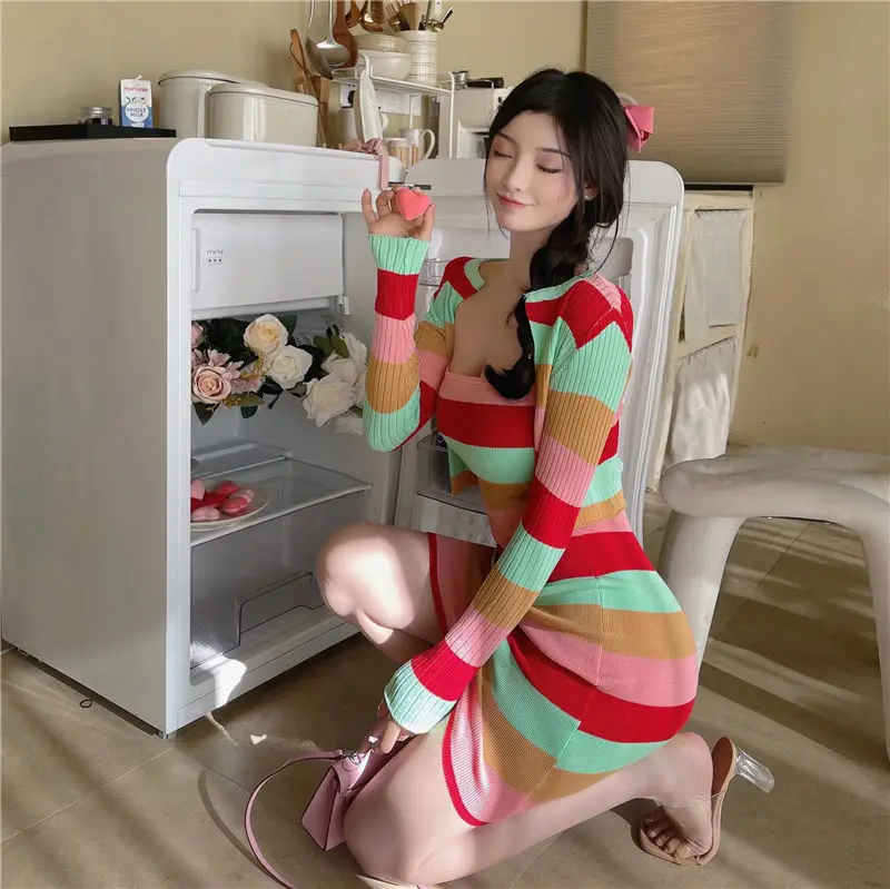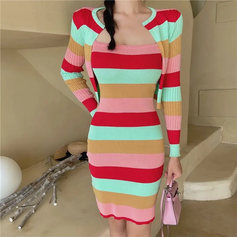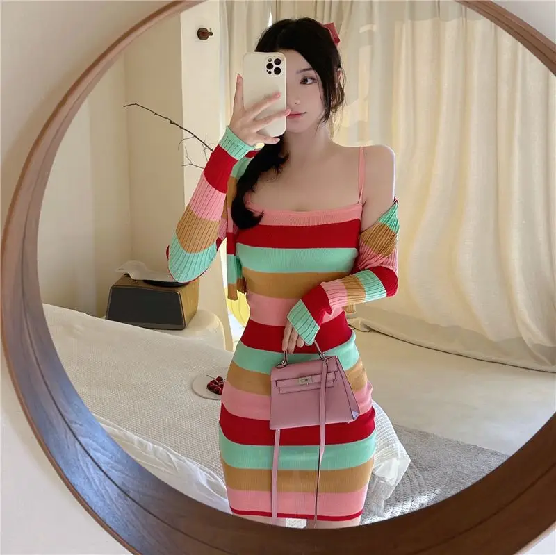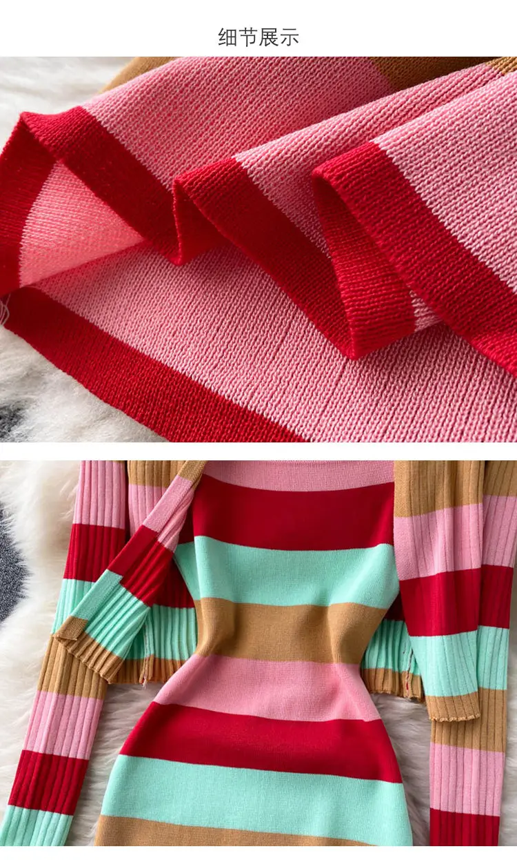 KYLTHOMASW - Sweet Hot Girl Suit Women's Autumn and Winter Striped Slim Fit Wrap Hip Strap Dress Long-sleeved Knitted Cardigan Two-piece Set