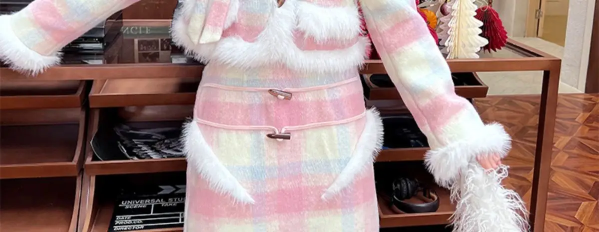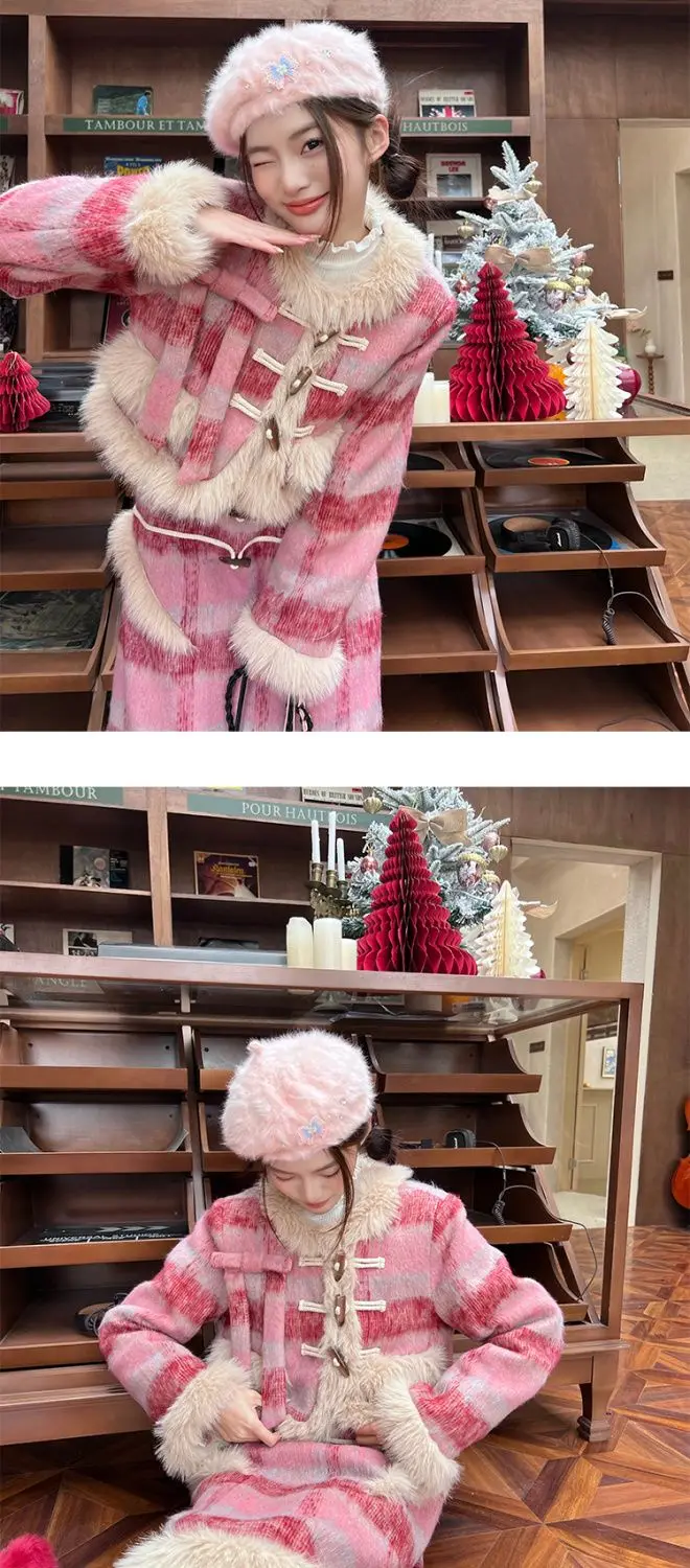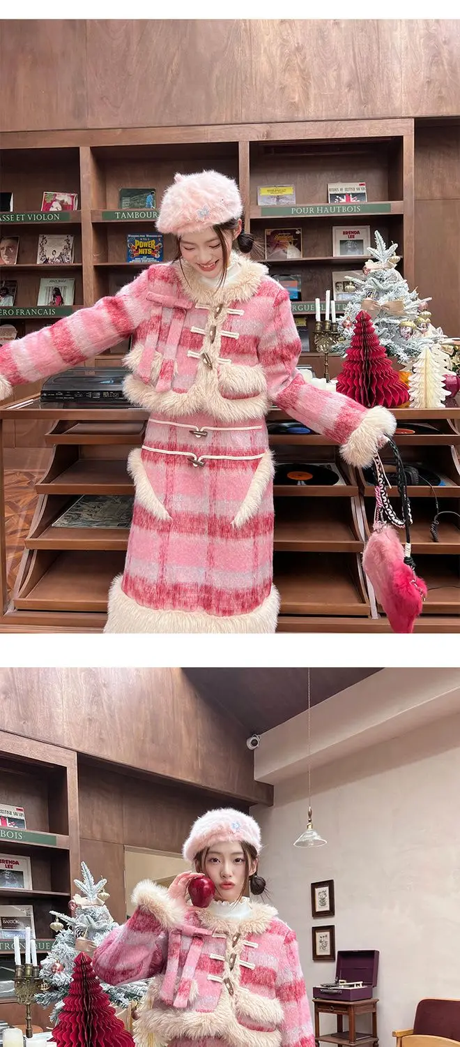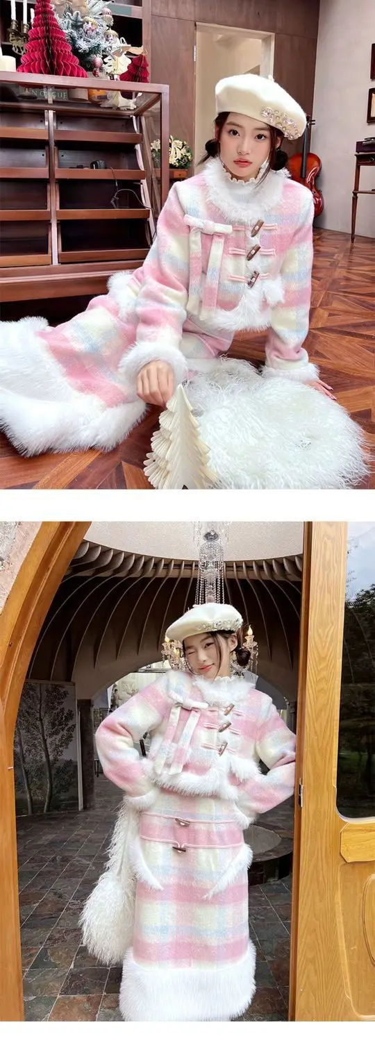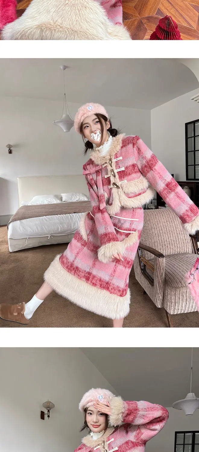 KYLTHOMASW - Winter Clothes New Splicing Sweet Woolen Set High End Bull Horn Buckle Grid Wool Coat Long Skirt Two Piece Set Women Outfits