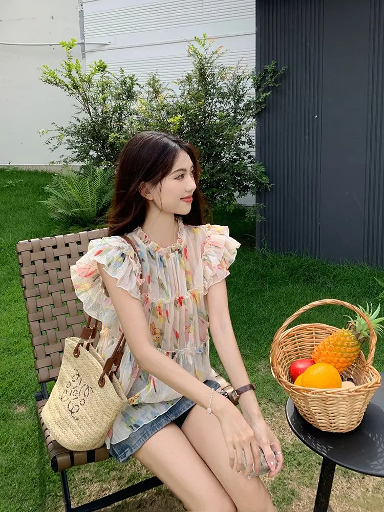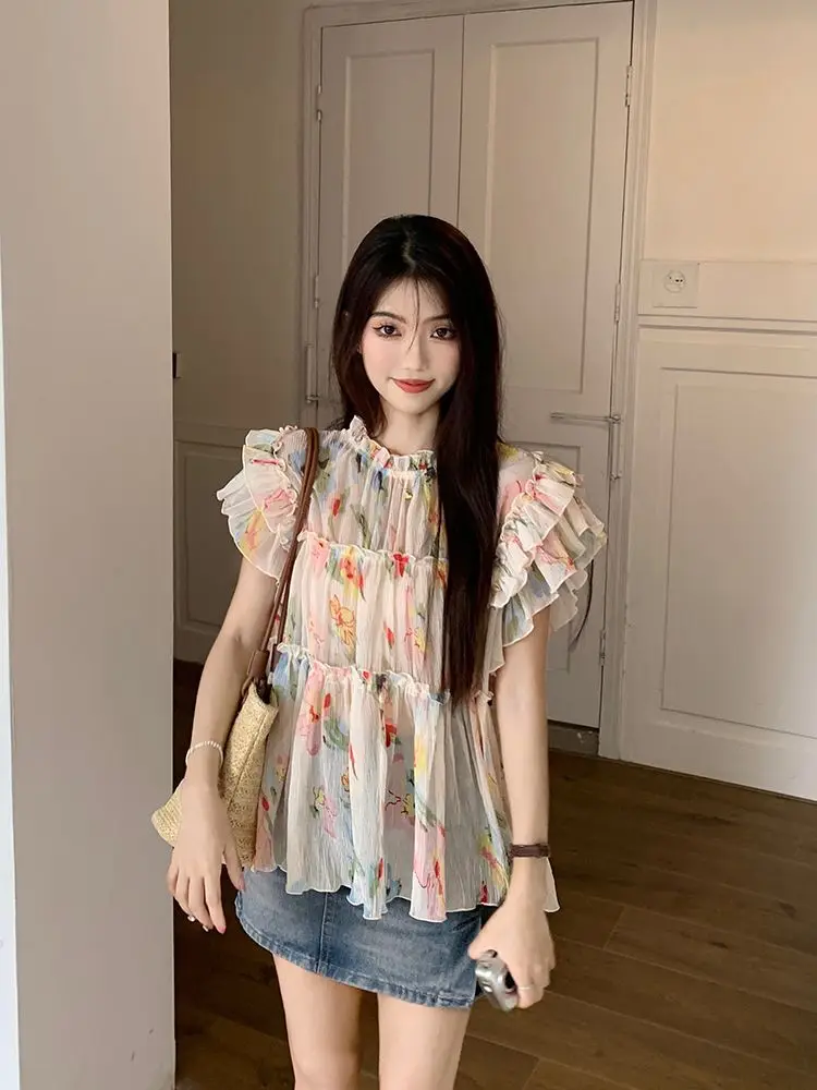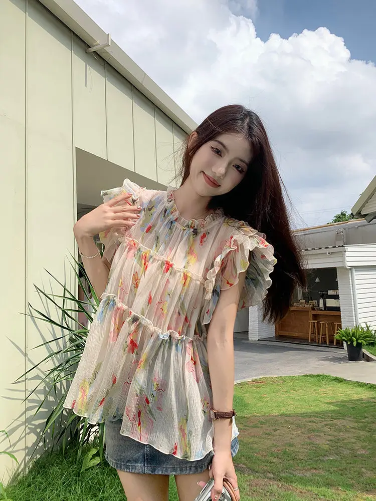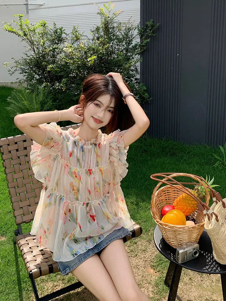 KYLTHOMASW - Y2k Floral Print Chiffon Blouse Women Flying Sleeve Perspective Fairycore Pleated Shirts Summer Fashion Aesthetic Tops